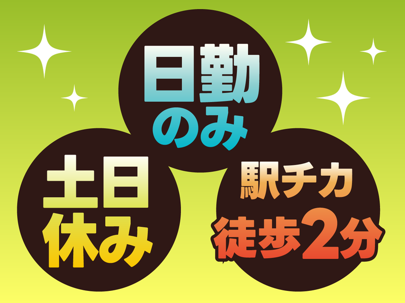 仕事内容 \日勤&5勤2休(土日休み)で生活リズムも安定♪/ ★《超・駅チカ》!名鉄「聚楽園」駅から徒歩2分! ★《冷暖房完備》だから寒い冬も暑い夏も快適♪ ★《専門的な知識・経験は一切不要》!未経験スタート大歓迎! ★製造デビューの方も《安心のサポート体制》です◎ <具体的な仕事内容> 車のエンジンに使用される電子部品を、 デスクに座って目視検査し、 良い物と悪い物を教えられたとおりに分けます。 ほとんどの方は未経験から始めています。 職場は空調完備なので、夏は涼しく、冬はあたたかい職場です。 <こんな方にピッタリ> ・友だちや家族と休日を合わせたい方(日勤&土日休み◎) ・通勤に時間をかけたくない!という方(最寄駅から徒歩2分♪) ・マイカー通勤を希望している方(無料駐車場あり♪) ・工学系の学校に通ったことがある方 ※2/11~2/17は弊社システム改修のため、 期間中にご応募いただいた方へのご連絡は、 2/18より順次対応させていただきます。 少しお時間をいただきますが、ご了承ください。 ――――― 東海プロスは尾張エリアを中心に、 製造・物流を中心としたお仕事を 多く取り扱っています。 専任の担当者が こまめに顔を出しますので、 なにか困ったことや わからないことがあれば スグに質問ができる環境です。 アナタをしっかりサポートします♪ 「フォローが手厚い!」と 実際に働いている方からも 評価をいただいております。 お気軽に何でも相談してくださいね!