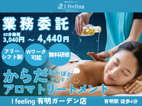 求人詳細 【業務委託】イヤーセラピスト 【給与】 ◆仕事の単位: 施術 ◆最低報酬額: 3040 円 ◆業務所要時間:60分 ◆合計給与額: 3040 円 【シフト】 週3日以上、1日8時間以上 【勤務地】 江東区 【最寄り駅】 メディア多数紹介!「耳ツボ×リラクゼーション×エステ」お客様の健康と美容に寄り添うサロン★1日8時間・週3~OK!【遠方の方はWEB面接も実施中】 I feeling(アイフィーリング)とは… 日本初のイヤー・スティムレーション(耳への刺激)による“睡眠革命サロン”です♪ 耳からのアプローチによって、迷走神経を刺激することにより脳がリラックスします。 同時に自律神経のバランスを整えることによってご自宅に戻ってからの睡眠の質を大きく改善し、上質の睡眠で体も心も健康にします。 まずば、お気軽にお問い合わせください。 《注目ポイント》 ーI feeling利用者のセキララVOICEー 耳の中のマッサージってなんだろう??と興味を持って受けてみたらハマりました。 自律神経を整えるのに効果を感じてます。他店ではあまり受けられない施術ですし、店員さんも皆さん感じがよく、予約も取りやすいので愛用させていただいております。耳と全身のオイルデトックスがおすすめ。(40代・女性) 寝起きが悪く、前から気になっていたので今回初めて行きましたが、耳だけでなく、首や背中などもマッサージしてもらえました。 終わった後の感覚は首の凝りなどが少し和らいだなって感じでしたが、今朝の目覚めが全然違ったので、驚きでした。 誕生日割りがあって、3割引だったのも嬉しかったです!(30代・男性) ー「ありがとう」をいただける。お仕事ー 口コミにいただいたように、当サロンにはお悩みをお持ちの方が多く来店されます。 その悩みをしっかりと聞くことも私たちの仕事です。 そのうえでケアできるコースのご提案をするようにしています。 お客様の心からの「ありがとう」は私たちの励みにもなっています♪ 試用期間詳細 試用期間なし 勤務期間 長期(3ヶ月以上) 特徴・メリット 高収入・高時給/体を動かす仕事/語学活用/すぐ働ける 待遇・福利厚生 詳細 <待遇> ◎報酬保障制度 ◎昇給有(査定制度有) ◎特別賞与 ◎表彰制度(個人・店舗) ◎社員登用制度有 <福利厚生> ◎結婚祝金20,000円 ◎傷害保険 ◎懇親会費支給 ◎社内レクリエーション ◎自社コスメ割引 <研修制度・資格> ◎研修制度有(講習料会社負担) ◎国内・海外研修制度 ◎フォロアップ、スキルアップ研修制度(AES) ◎リラクゼーションセラピスト2級受験資格取得 休日について ●フリーシフト制 応募後のプロセス 下記ご参照ください。 応募先電話番号 0120-980-552 応募と応募後の流れ ●応募フォームよりご応募 ↓ ●面接可否を、電話もしくはメールにてお知らせ致します。 ※ドメイン指定受信の解除を予めして下さい。 ↓ ●担当者と面接(web面接可能) ↓ ●採用決定 ↓ ◎入社 ※採用方法が変更となる場合もございますので、ご了承ください。 【面接地】 本社または現地、現地周辺にて