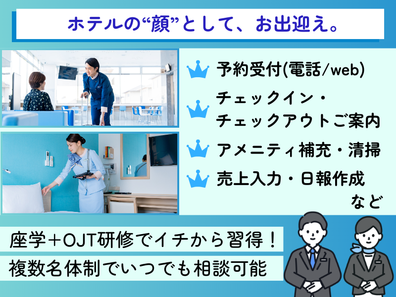 仕事内容 \\\こんな毎日が、現実になる/// ⏩退勤後にそのまま弾丸海外旅行 ⏩平日の混雑していないアウトレットでショッピング ⏩好きなアーティストのライブは全日程制覇! オフの日は、誰にも邪魔されず、とことん“好き”に没頭 そんなライフスタイルを叶えながら、 ちゃんと正社員として働ける環境がここにあります。 ――――――――――――――――――――――――― ✅お任せするのは… ■宿泊予約の受付・変更(電話・Web) ■チェックイン/チェックアウト対応 ※自動チェックイン機の操作案内が中心 ■備品・アメニティの準備・発注 ■ロビー・館内の巡回、簡単な清掃 ■売上入力・日報作成(PC作業) 【POINT】 ✅ 語学力は不問ですが、英語や中国語などのスキルを活かせます。 他言語を学ぶ人大歓迎 ✅ 経験不問/ブランクOK ✅ OJT研修あり/現場は常時複数名体制で安心 ――――――――――――――――――――――――― ▼1週間とあるスケジュール(例) 月曜10:30〜火曜11:30:勤務 火曜午後〜木曜:完全フリー 金曜10:30〜土曜11:30:勤務 土曜午後〜月曜:完全フリー →1回の勤務は少し長め(25時間) でもその後は、まるっと2日お休み! 「え?こんなに休みがあるの?」と思った方。 はい、本当です。 年間休日は169日が“あなたの時間”になります。 ――――――――――――――――――――――――― ▼充実研修で、未経験でも安心スタート 基礎から学べる研修&先輩のサポートで、 初めてのホテル勤務でも大丈夫◎ 敬語やあいさつ、電話対応、お辞儀の角度まで、 ホテル接客の基本を一から学べる研修があるので安心。 研修後も、OJTで先輩がしっかりフォロー。 店舗では複数名体制なので、 わからないこともすぐに聞けて、焦らず成長できます。