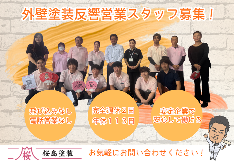 仕事内容 ✅現場経験からキャリアアップ ✅飛び込み営業&ノルマなし ✅インセンで年収UP可 ✅施工管理にも携われる 三河エリアで知名度の高い 「桜島塗装」で HPや口コミ・紹介経由の反響案件に 対する提案営業~簡単な施工管理までを担当。 現地調査(約1h) →見積・プラン提案 →契約→工期調整・発注 →品質・安全確認 →引渡しが基本フロー。 ひと月5件前後を主担当、 相談は月20件ほど。 営業しやすい土台が整っており、 職人・施工管理の経験をそのまま武器にできます。 ▼<具体的には…> ・HPや口コミ経由のお客様へ 提案 ・現地調査~見積もり作成 ・契約~簡単な施工管理 ・職人との打ち合わせ ・お引き渡し対応 ▼1日の流れ 8:00 朝礼・進捗確認 9:00 現場確認・職人打合せ 11:00~16:00 現地調査・商談(1~3件/1件30~60分) 16:30 帰社・見積・事務処理 18:00 終業 <⭐“業界では珍しい”休みの取り方> 完全週休2日・年休113日。 土日いずれか+平日1日でシフト調整でき 長期連休(GW・夏季・年末年始)も確保。 夜遅い訪問や過剰な残業を 良しとしない運用で スケジュールは 自分で組み立て。 家族行事、趣味、学び直しなど 「私生活も攻める」働き方を後押しします。 <⭐営業しやすさの“勝ち筋”あり> 完全反響型。社長イラストの広告と 口コミで 月20件規模の相談が自然流入。 断られにくく、課題ヒアリングと 技術的な解決提案に集中できます。 現場経験者なら 劣化診断・工法選定・付帯工事の要否など “深度ある提案”で差がつきます。 成約後は段取り良く回し 顧客満足→紹介へつなげる流れが定着。 <⭐現場から“仕切る側”へ> 単なる売り切り営業ではなく、 工期調整・職人アサイン・安全品質の 確認まで担う“ミニ現場監督”。 段取り力やリスク先読み力が評価されます。 施工管理技士などの資格取得支援あり。 将来は所長・工事責任者・営業リーダーなど 現場×顧客対応のハイブリッド人材へ。 <⭐数字で報いるインセン&評価> 担当3~4件で+10万円のインセン実績あり。 昇給は随時、賞与は年2回。 「案件の質」「顧客満足」「段取りの巧さ」 も評価に反映。 経験者が成果を出しやすい土台があります。 <⭐“なんとなく入社”からでもOK> 立派な志望動機は不要。 まずは見学や面談で 現場感・人・案件の質を 確かめてください。 三河密着の地の利と、 少数精鋭のスピード感が合えば、 入社後に目的は自然と明確になります。