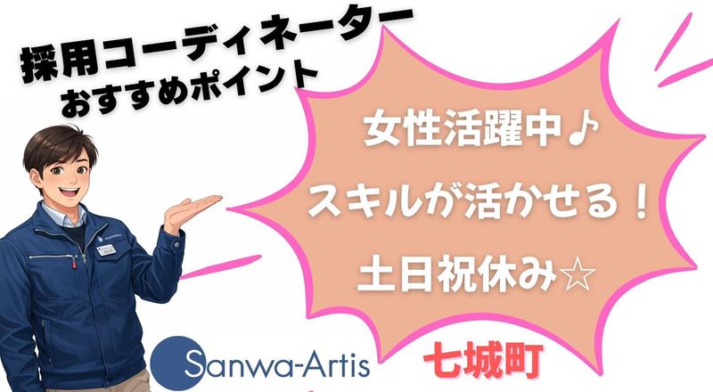 仕事内容 あなたのライフスタイルにあわせた お仕事みつけませんか 【求人コーディネーターよりごあいさつ】 サンワの求人をご覧いただき、ありがとうございます。 私たちは『共に学び、共に生長する』という企業理念のもと、すべての方により添うことを大切にしています。 本日は最後までみていただけるとうれしいです。 お仕事のあいまで見てくださってる方は右下の『保存ボタン』で後からじっくり♪ 【採用コーディネーターより】 ━━━━━━━━━━━━━━━ 工場を支える事務業務♪ 土日祝休みで私生活も大切に☆ 女性スタッフが多数活躍中! ━━━━━━━━━━━━━━━ 菊池市にある工場にて、 総務事務の業務をお任せします。 現在20代から40代の男女が 幅広く在籍している職場です。 ━━━━━━━━━━━━━━━━━━━ ⭐業務内容の詳細 ━━━V━━━━━━━━━━━━━━━ ✅パソコンを使用したデータ入力や 商品の発注作業を担当します。 └Excelを使用する業務です。 ✅社内でのメール対応を 行っていただきます。 ✅社内で使用する備品の管理や 各種資料の作成をお願いします。 ✅その他、総務事務に付随する 関連業務をお任せします。 ━━━━━━━━━━━━━━━━━━━ ⭐アピールポイント ━━━V━━━━━━━━━━━━━━━ ✨事務の経験やPCスキルを活かして 即戦力として働ける環境です♪ ✨土日祝がお休みなので、 家庭やプライベートも充実します☆
