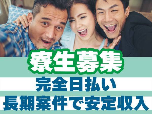 【保険制度】 雇用保険、労災保険、健康保険、厚生年金 待遇・福利厚生 ●急な出費も安心! 「全額日払い制」 →勤務後、当日に現金手渡し! ★友達と食事!デート!レジャー!など 遊び予定に合わせて働いて現金をゲットできます! ●経験や資格に応じて日給アップ! ●残業時は別途、残業手当を支給 【特別入社手当】 ・作業用品プレゼント ・寮費1ヶ月無料 ※すべて当社規定により支給。 加入保険 健康保険あり・厚生年金あり・雇用保険あり・労災保険あり