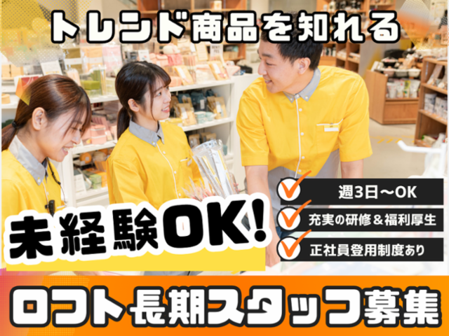仕事情報 ● 仕事内容 お客さまの対応やレジ、ラッピング、慣れてきたら売り場づくり も行います。一つずつ覚えていけるので未経験でも大丈夫!お客 さまの「何コレ!」「面白い!」という驚きの声に、私たちも心 弾む毎日です。多くの人と触れ合い笑顔にするやりがいは抜群。 ロフトならではの刺激と感動に満ちたアルバイトを始めませんか 季節を楽しむ売り場づくり ロフトの魅力の一つは、シーズンごとに入れ替わる商品。お客さ まに春夏秋冬を楽しんでいただけるように、季節のイベントにマ ッチした提案を行っています。季節のイベント、流行りのコスメ 、話題の商品などジャンルもさまざま!ロフトでアルバイトを すると、一年が楽しくあっという間に過ぎていきます! 大切なのは遊び心 私たちは、モノ・コトの新しい楽しみ方を提案しています。ただ 商品を売るのではなく「新しいコトを予感させるモノ」を提案す るお仕事なのです。この求人を読んでワクワクした方なら素質充 分◎やりがいあるアルバイトをお探しの方にぴったりです。黄色 いユニフォームに着替えれば、あなたもロフトメンバーの一員! 雑貨好きにはたまりません あなたはデザイン性重視?機能性重視?ロフトならどちらも豊富 に取りそろえており、雑貨好きにはたまらない環境です。お洒落 、勉強、コーヒータイムetc.「おはよう」から「おやすみ」まで 、私たちの生活は多くの雑貨で成り立っています。豊かな暮らし をお手伝いするここ、ロフトで、一緒に楽しく働きましょう! ロフトとは 2022年に創業35周年を迎えたロフト。生活雑貨を扱うチェーンス トアとして、全国に120店舗以上を展開中。常に「今を生きる人 のライフスタイル」を考え、令和なら<SNS映えして、しかも便 利>そんな商品を筆頭に、定番から新商品まで多彩に提案。ワク ワクする売り場から暮らしに小さなHAPPYをお届けしています。