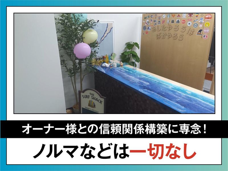 求めている人材 <以下のような背景を持つ方が活躍しています> *営業や販売職などで培った、対人コミュニケーションの知見がある方 *宅建などの資格を取得して活躍したい方 └宅地建物取引士の資格は不問です。入社後の取得を目指す意欲は資格手当などで正当に反映されます! 【採用担当からのメッセージ】 私たちはスキル以上に、周囲への配慮や誠実さを何よりも大切にしています。だからこそ、今回は「人柄と経験」を重視した採用です。オーナー様とじっくり向き合い、私生活も大切にしながら、腰を据えて活躍したいと願う「誠実な方」をお待ちしています。