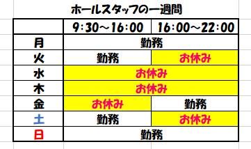 シフト制 勤務時間詳細 実働時間:1日あたり8時間 平均勤務日数:1ヶ月あたり21日 〜 22日 9:30~16:00 16:00〜22:00 9:30~22:00 ※実働8時間 交代制 休憩あり 柔軟に対応します。ご相談ください。 1週間の勤務例 月曜日 休日 火曜日 9:30〜22:00(休憩120分) 水曜日 9:30〜16:00(休憩30分) 木曜日 9:30〜16:00(休憩30分) 金曜日 休日 土曜日 16:00〜22:00(休憩30分) 日曜日 9:30〜22:00(休憩120分)