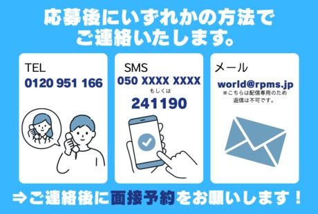 選考プロセス ※応募後に下記いずれかの方法で 面接日調整のご連絡させて頂きます。 TEL:「0120-951-166」 Mail:「world@rpms.jp」 SMS:「241190」 または 「050~」 から始まる番号 【面接】 面接会 :面接時履歴書不要、服装自由で来場OK (1)全体説明(約30分): 業務内容や就業条件などを説明 (2)個別面談(約10分): 不明点や、希望を伺ってシフトを決定 【採否連絡】 即日~3日以内にはお伝えします! 【入社】 入社日当日… オリエンテーションを実施《4時間》 入社書類のご提出や、契約の締結、 倉庫内で安全に就業頂くための説明会です。 ※面接、入社日はご相談に応じます。 ================= ★選べる面接方法! 【対面/オンライン面接】 【対面】: 坂戸駅周辺で実施! 【オンライン】:無料ZOOMにてご自宅で実施 ※面接方法や開催時間は変更になる場合もございます。 ※ZOOMアプリのダウンロード方法や使用方法などは 事前にお伝えするのでご安心下さい♪ 【問合せ先について】 問合せ先:0120-951-166 この雇用契約は株式会社ワールドスタッフィングと結ばれますが、 仕事は請負業者の事務所(請負先)で行われるため、勤務先住所は事業所住所とは異なります。 応募方法 【応募】 電話・WEBから応募