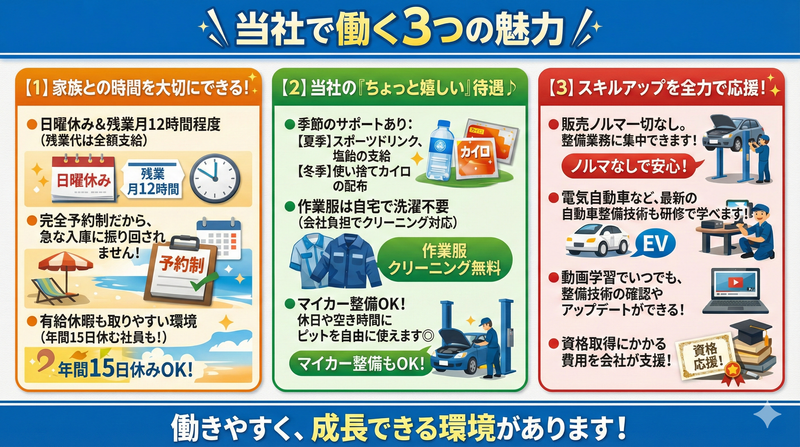仕事内容 仕事内容 動画で覚える整備士デビュー! 難しい作業はあとでOK。 日曜休み×残業ほぼなし=家族サービスも バッチリ。 未経験でも育つ環境で“自分の技術”を 手に入れませんか?  ̄ ̄ ̄ ̄ ̄ ̄ ̄ ̄ ̄ まず最初に…こんな 悩みありませんか? _________ 「整備の仕事に興味あるけど、難しそう…」 「家族がいるし、夜遅くまで残業とかムリ…」 「資格とか経験とか、自信ない…」 大丈夫。 当社ではいきなり “エンジン分解してみて!” なんて言いません。 まずは動画を見て イメージすることからスタート◎ 実践に入ったら、 先輩が隣でサポートします!!  ̄ ̄ ̄ ̄ ̄ ̄ ̄ ̄ ̄ ̄ ̄ ̄ ̄ ̄ 未経験3ヶ月で“24ヶ月点検” までできるヒミツ ______________ 大手車検チェーンならではの 充実した研修システムを活用しています! \コバック公式「動画学習」/ ・実際の作業を動画でおさらい ・わからなかったら巻き戻す (何回でもOK) ・現場では先輩が横で待機 ・急かされないからマイペースで覚えられる 気がついたら、 「あれ?オレ、24ヶ月点検できてるやん…!」 ってなるやつです。 ※この気づき、だいたい3ヶ月。  ̄ ̄ ̄ ̄ ̄ ̄ ̄ ̄ ̄ 働き方は…正直 かなりホワイトです _________ ✔ 日曜休み!家族イベントも行ける♪ ✔ 完全予約制=無茶な入庫なし! ✔ 平均残業12時間 → 月に数回チョイ残業くらい ✔ 18時には全員帰宅してます ✔ 有給も取りやすい(年間15日取る人も) ✔ 販売ノルマなし!整備業務に集中できる! ✔ ピット使って“愛車いじり”OK♪ 夜に子どもの宿題を見たり、 休日に家族でイオンに行ったり、 普通の家庭生活ができます! 「整備士=帰れない」 そんなイメージ、当社にはありません。  ̄ ̄ ̄ ̄ ̄ 仕事内容 _____ 扱うのは 乗用車〜2tトラックまで。 やることはこんな感じ↓↓ ・車検(コバック方式のサクサク作業) ・12ヶ月/24ヶ月点検 ・オイル交換、タイヤ交換 ・ハイブリッドやEVの整備 ・スキャンツールで診断 ・お客様へ「ここ直しましたよ〜」の説明 むずかしい言葉は後で覚えればOK。 動画 → 現場 → 反復 の“いつもの流れ”で 覚えていきます。  ̄ ̄ ̄ ̄ ̄ ̄ ̄ 入社後の流れ _______ 1.コバック動画学習 2.1泊2日の研修(名古屋) 3.現場でアシスタント作業 4.同じ作業を繰り返して定着 5.気づいたら点検もひとりでできる 6.資格も会社負担でゲット ガチで、ムリなく育つ仕組みです!  ̄ ̄ ̄ ̄ ̄ ̄ ̄ ̄ ̄ ̄ 最後に…ちょっとだけ 真面目な話 __________ 当社は“地域の生活を支える工場”で ありたいと思っています。 車のことが不安な人に 「大丈夫ですよ」と言ってあげられる、 そんな整備士になってくれる仲間を 探しています。 まずは履歴書はいりません。 気軽に見学してみませんか? あなたのペースでOK。 そのかわり、あなたの未来を ちゃんと育てます。
