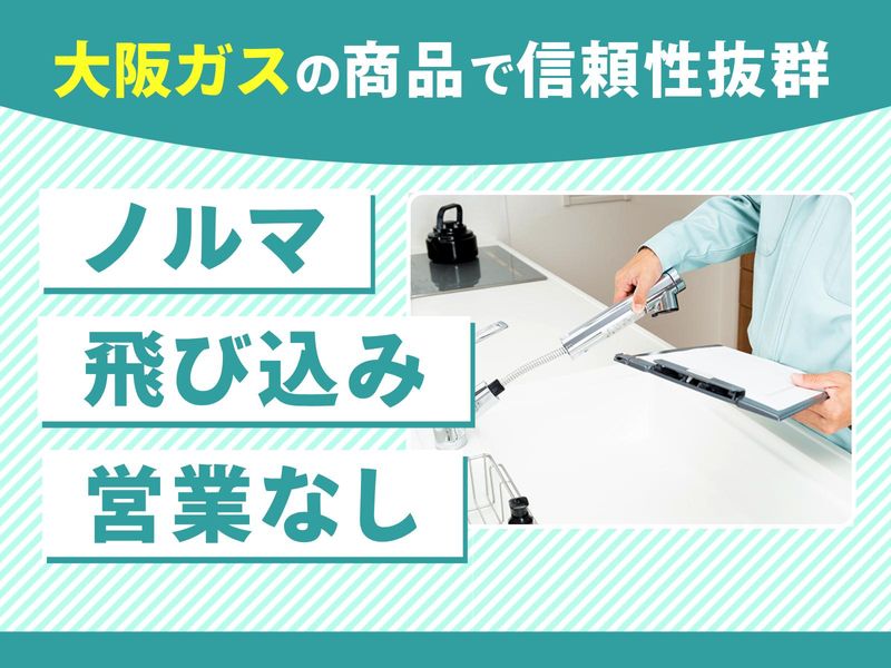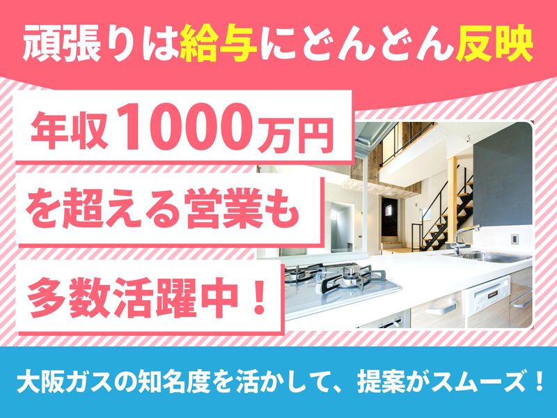 仕事内容 \2026年4月!業績拡大に伴い人員募集/ 北大阪リフォームガス株式会社は会社に新たな風吹かせてくださる貴方をお待ちしています! *リフォーム営業の経験が活きる! *大阪ガスブランドで提案がスムーズ! *年収1000万円以上も目指せる! *月給35万円スタートも可能! 【仕事内容】 ガス機器や住まいに関するご提案をお任せします。 <具体的には> 〇ガス機器の製品提案 〇住まいに関するお困りごとのヒアリング 〇最適なサービスのご案内など <入社後について> あなたの経験を即戦力として評価します! 大阪ガスの商品知識は丁寧にレクチャー♪ これまでの営業ノウハウをすぐに活かせます! ブランクがあってもスムーズに復帰可能! すぐに高収入を狙える環境です★ 【ブランド力で売りやすい】 知名度抜群の大阪ガスブランド! 圧倒的な提案のしやすさが魅力です♪ これまでの営業経験を存分に発揮できます! 【頑張りは収入に直結★】 売った分の成果はダイレクトに反映! 30代で年収1000万円以上の実績多数♪ 「頑張り=収入」を目に見えて実感できます! 【前職給与を最大限考慮】 即戦力として高待遇でお迎えします! 月給35万円からのスタートも夢じゃない♪ キャリアアップもスピーディーに叶います! 【プライベートも大充実】 GWや夏季、年末年始の長期休暇あり! 17時半定時でメリハリをつけて働けます♪ 家族との時間もしっかり確保できます◎