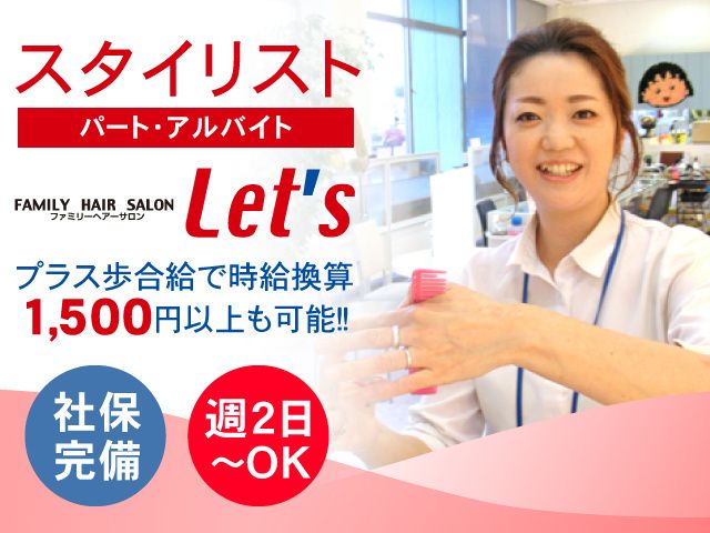 仕事内容 《 パート 》スタイリスト(美容師)募集! あなたのスケジュールに合わせて 無理なく勤務できます! ブランクがあってもご安心ください。 ブランクから復帰されたスタッフが 多数している美容室が【Let's】です! もう一度美容師としてスタートしませんか? /////// POINT ///////// ◎週2日~勤務OK! ◎1日4H~OK!時短勤務も可能! ◎5年~10年のブランクからの 美容師スタッフが当社で 多数復帰して活躍しています!! ◎主婦(夫)さん、 子育てママさん活躍中! ◎40代、50代、60代の 中高年、ミドル世代活躍中! ◎扶養範囲内OK! ◎入社前の事前研修があり安心! ◎残業なし! 当社独自の歩合給もありますので、 短い時間でもしっかり稼げます! 働き方ご相談ください。 〈給与例〉======== 【勤務歴4年】月収152,542円(時給1,364円) ◆出勤日数15日(114時間勤務)+歩合給 【勤務歴5年】月収216,295円(時給1,584円) ◆出勤日数21日(181時間勤務)+歩合給 【勤務歴6年】月収282,602円(時給1,551円) ◆出勤日数20日(142時間勤務)+歩合給 =============== ・社会保険完備 ・有給休暇年間12日間(月1日程度) ・・・など、福利厚生充実! なので、在籍年数10年以上のスタッフが、 300名中120名以上! 創業40年、信頼と実績のある企業 株式会社ユーアンド・美容室レッツで 長期に安定してお仕事しませんか。 =============== <募集職種> パート・アルバイト/ ヘアスタイリスト(美容師) <仕事内容> 美容室スタッフとして カットやカラーなどお客様への施術、 サロン内業務全般をお願いします。 1日4時間から勤務可能なので 短時間から勤務できます。 また、オートシャンプーを導入しているので 手荒れや腰痛、体の不調などで 断念した方も安心して働ける環境です。 ヘアスタイリストとしてお仕事したい方に オススメです! <予約制・指名制なし> 予約や指名中心の店舗ではありませんので、 たくさんのお客様に入客するチャンスがあります。 受付もあるので個々の負担が少ないのも魅力です。 〈お客様の客層について〉 白髪染めメインのご来店も多く、 シニア世代の方々にも多数ご来店・ ご好評いただいています。 (65歳以上/30%、お子様/30%) 〈 安心のサポート・教育体制〉 現在活躍しているスタッフは 【5年以上/6割・10年以上/4割】 ブランクから復帰している実績有り! 配属前に本部研修を実施しています。 技術教育動画も充実していますので、 安心して現場に復帰可能です! また、店舗での日々の研修の他に、 希望者のみ、 ・本部でのカット講習 ・インストラクターによる、 ワインディングやカラー塗布などの 講習も実施しております。 < 40歳以上の方も多数活躍中! > 長く現役で働けるのも魅力の一つ。 30代・40代の女性を中心に 20代~50代・60代まで幅広く活躍中です。 子育てが落ち着き、もう一度働きたいと 思ったスタッフも多く働いています。 勤続10年以上のスタッフが 約120名在籍しています(2024年3月現在) < 日数・時間の相談のOK > ご家庭や育児を優先して働けるよう、 都合にあわせてお仕事可能です! 周りには同様の境遇のスタッフも いるので、協力体制もバッチリなので 安心してお仕事ができます。 ・・・・・・・・・・・・・・・・・・・・・・・・・・・・・・・・・・・ ハローワークで探してるけど なかなかみつからない… 時間の融通がきく働き方をしたいなど まずはお気軽にお問合せください! ・・・・・・・・・・・・・・・・・・・・・・・・・・・・・・・・・・・
