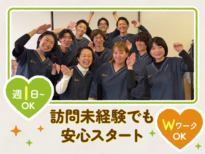 求めている人材 【必須】下記いずれかの資格をお持ちの方 ※理学療法士 ※作業療法士 ※言語聴覚士 ◎訪問の経験は不問 フォロー体制が整っているので、病棟等での実務経験があればOK! 【歓迎】 〇訪問リハビリに興味がある方 〇今の働き方や待遇をもっと良くしたい方 〇日勤で安定して働きたい方 〇人間関係のいい職場で働きたい方 〇ライフワークバランスも大切にしたい方 *経験不問/ブランクOK/復職OK *第二新卒歓迎/フリーター歓迎 *主婦(夫)活躍中/主婦・主夫歓迎 *正社員経験不問 *20代活躍中/30代活躍中/40代活躍中 *男性活躍中/女性活躍中 *ハローワークでお探しの方も歓迎 <所属スタッフ> *合計49名 *男女比…男性4:女性6 *平均年齢30代 20代~70代の幅広い世代が活躍しています! ~ こんな雰囲気です! ~ 病院では効率も求められますが、訪問では利用者一人ひとりにじっくり向き合うケアが可能です。訪問は1人あたり30~60分と時間が決まっているため、業務が圧迫されることもありません。専門的なスキルは必要ですが、当社には訪問担当のスタッフが多数在籍しており、仕事の相談もしやすい環境です。和気あいあいとした雰囲気の中で、専門知識を身につけながら働けますよ!