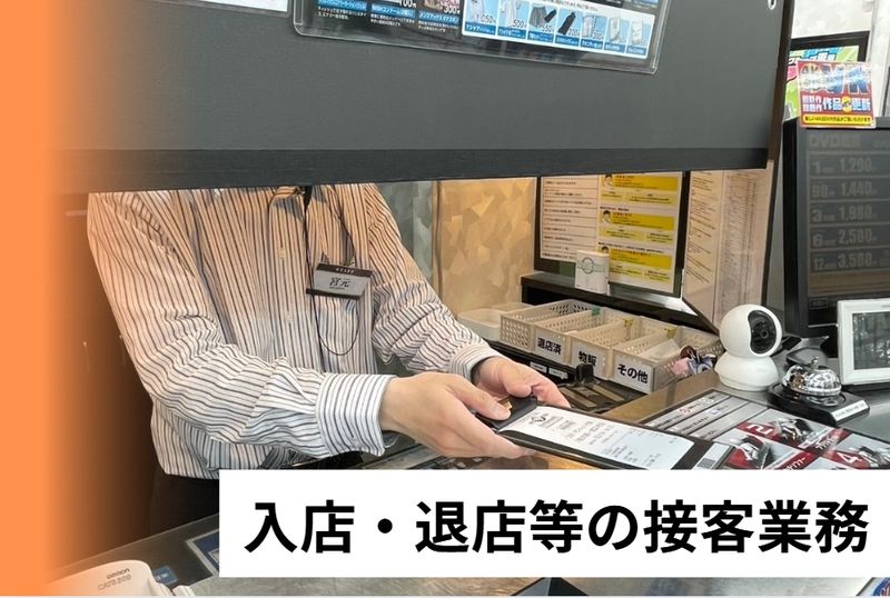 仕事内容 ①清掃業務 客室、トイレ、シャワーなどの共有部の清掃 ②接客業務 入店、退店受付などのフロント業務 その他、DVDの返却、商品の入庫・陳列・在庫管理など 最初は失敗して当たり前!マニュアルもあるので安心です! 【在籍スタッフへのインタビュー】 ◆男性フロントスタッフ 入社1ヶ月Cさん 前職:介護職 業務マニュアルがしっかり整備されていて、新人のときもスムーズに覚えることができました。 忙しい時間帯はありますが、スタッフ同士で声をかけ合って助け合える雰囲気があり、安心して働けています。 ◆男性フロントスタッフ(店長) 入社 2年Bさん 前職:調理スタッフ(店長) 当社では休憩の取り方を「1時間に1回、5分~10分程休憩を取る事が可能」なので新人の方も無理せず勤務して頂けると思います。 また、匿名で相談できる窓口もあるのでお仕事に集中できる環境が整っていると思います。 ★「なんとなく不安」「自分に合っているかな」」等仕事探しは不安なことが多いですよね。。。 そんな方は是非お話だけでも聞きに来てください! 沢山のご応募お待ちしております! 一緒にお店を、盛り上げていきましょう!!