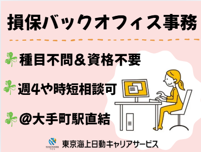 仕事の内容 \週4や時短相談OK/ ◆残業少なめ×月25万~ ◆ご経験の種目不問&資格不要 ◆直接のお客様対応はありません! 【基本情報】 雇用形態:派遣社員 雇用期間:長期(3カ月以上) └1月~開始日相談可能 就業時間:9:00~17:30(休憩60分) 【必須条件】 ◆損保事務のご経験がある方 ◆パソコン:基本操作(入力~修正、SUM関数) 【お仕事内容】 法人向け×損保バックオフィス事務 ・見積書、申込書作成 ・不備点検~計上 ・電話対応 └電話の相手は社内の営業や保険会社の方 [取扱い]東京海上日動の法人商品 *個人のお客様対応はありません ▼フォロー専任の社員さんがいるから安心! ▼勤務時間内に、商品知識やシステム操作確認できる勉強会もご用意してます 【環境面等】 @大手町駅直結/最寄り駅から徒歩2分 └高級感あふれる高層オフィスタワー └専用のリフレッシュフロアも利用OK ・20代・30代・40代・50代の多い職場 └派遣スタッフさん多数活躍中! ・ランチタイムは休憩スペース利用OK └お弁当持参OKです ・オフィスカジュアル内で服装自由 【福利厚生等】 ・社会保険完備 ・ベネフィット・ステーション ・定期健康診断あり ・禁煙オフィス!煙苦手な方も安心 ・平日のみOK!土日祝休み ・年間休日120日以上&お休み相談可 └有給休暇 ○●ご応募検討中の方へ●○ 何かしらの損保事務経験があれば、ご対応いただけるオシゴトです!もちろん、法人契約のご経験がある方も大歓迎☄少しでも気になった方は、ぜひお気軽にご応募ください♪ ○●嬉しいPOINTたくさん!●○ 履歴書不要!開始日、幅広く相談OK/複数名募集*長期×フルタイム/週4日や時短勤務相談OK/駅直結の快適オフィス/ブランクOK!経験種目は問いません!損保資格も不要です