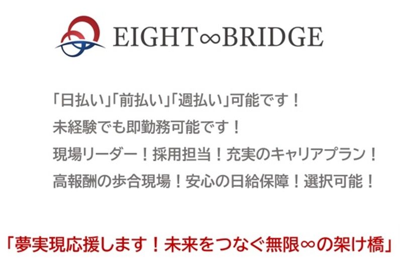 アピールポイント: ⭐️⭐️エイトブリッジのGOODポイント①⭐️⭐️ 自社に不動産事業部門もございます。 案件と住居をセットで提案が可能! お仕事して頂く方は敷金礼金当然無料! ⭐️⭐️エイトブリッジのGOODポイント②⭐️⭐️ 職業紹介(27-ユ-305073)も行っておりますので 例えば家族が増えたり家庭環境が変わって業務委託ではなく正社員として 働きたくなった際はご相談下さいませ! ⭐️⭐️エイトブリッジのGOODポイント③⭐️⭐️ インボイス番号なくても報酬減額致しません! インボイス番号がないと10%減額になるケースもありますが 弊社でインボイス番号がない方から10%減額することはありません!