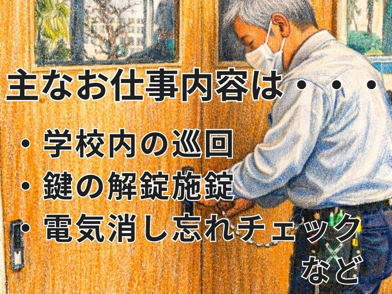 仕事内容 \もう一度、“社会に役立つ仕事”を/ 大田区南馬込にある中学校での 施設管理スタッフ 「退職後も、まだまだ誰かの役に立ちたい」 「年金の足しに、ちょっとした収入がほしい」 「決まったリズムの中で、健康的に体を動かしたい」 そんな想いをお持ちの50代~70代の男性が、今まさに多数活躍中! 地域に根ざした安心の仕事で、第二の人生を始めてみませんか? ▼お任せするお仕事 ・校内の見回り・巡回 ・施錠・電気の消し忘れ確認 ・施設に異常がないか点検 ・簡単な備品管理・報告 ・特別な資格・経験・体力は不要です。 重い荷物を持つこともないので、どなたでも無理なく始められます! ▼この仕事の魅力ポイント ✅ 未経験歓迎&年齢不問 ✅ 60代以上の方も現役活躍中 ✅ 社会貢献できる仕事 ✅ 有給休暇100%取得OK ✅ Wワーク・扶養内OK ✅ 研修&サポート充実(動画マニュアル+丁寧なフォロー) ✅ 子どもたちの声に元気をもらえる職場環境