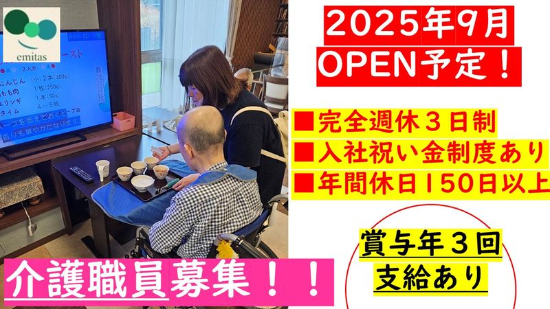 【仕事内容】 2025年9月オープン予定のサービス付き高齢者向け住宅にて介護職員を募集します! 【三重県から“三ツ星”認定!】 エミタス株式会社は、三重県が推進する「働き方改革推進企業認定制度」において、最上位ランクの“三ツ星”認定を受けた福祉事業者です。 この認定は、柔軟な働き方・ワークライフバランスの実現・職場環境の整備などの取り組みが高く評価された証。 子育てや介護との両立、ライフスタイルに合わせた働き方を応援しています! ◎アピールポイント ・オープニングスタッフ ・完全週休3日制 ・賞与年3回支給 ・入社祝い金制度あり ・資格取得支援制度あり ・未経験、ブランクある方歓迎 ・髪色自由 ■お仕事内容 サービス付き高齢者住宅内での訪問介護業務をお任せします。 ・身体介護 ・生活援助 ・ご利用者様の入浴、食事、掃除、買い物などのお手伝い。 ■働くスタッフの1日の流れ <午前中> 6:00起床介助 7:00朝食介助 8:00排せつ介助・デイサービスへの送り出し 9:00 朝礼・ 排せつ介助 10:00 入浴介助・ 掃除支援 おやつ介助 12:00昼食介助 <午後> 13:00口腔ケア・排せつ介助 14:00 入浴介助 ・ 掃除支援・ おやつ介助 17:00夕食介助 18:00 排せつ介助・口腔ケア 20:00 就寝介助 ※個々に合わせた業務になりますが、1日の業務のイメージです 【働きやすさ×自分らしく活躍できる環境が整った職場です】 エミタスでは、職員一人ひとりのライフスタイルや価値観を大切にし、「休みやすい・働きやすい職場づくり」に取り組んでいます。 子育てや介護など家庭の事情に応じた勤務調整や休暇取得にも柔軟に対応しており、男女問わず安心して長く働ける環境を整備しています。 女性が管理職としても活躍しており、多様なキャリアを築ける職場です。 さらに、若手の意見やチャレンジも積極的に取り入れ、「やってみたい!」が実現できる風土が根づいています。 SNS発信や自社ホームページ運営など、広報活動にもスタッフが主体的に関わっており、働く喜びを広げています。 いきなりで不安な方は、見学など行なっておりますのでご連絡ください。 ご連絡・ご応募をお待ちしております。 【求人ID-EMT01】