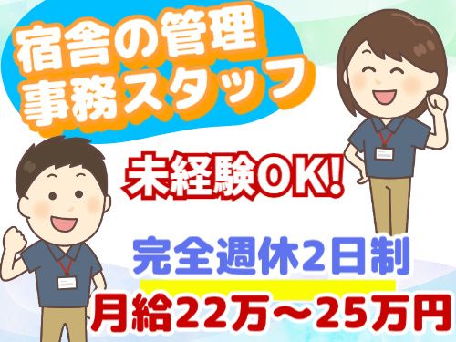 仕事内容 \オープニングスタッフ募集/ 宿舎の管理・事務のお仕事です! 完全週休2日 「プライベートも大切にしながら安定収入を得たい」そんな方にピッタリ! 未経験からでも安心して始められます。 【注目ポイント】 ・未経験からでも高収入! 月給22万~25万円! ・正社員登用あり ・完全週休2日 ・大型連休あり ・男女スタッフ活躍中 【お仕事内容】 宿舎の管理 ・入退去の管理 (入退去の事務作業や、宿舎での生活している中でのサポート) 事務作業 ・システムの入力業務、電話対応など その他、会社への報告や、宿舎の清掃作業など ※未経験の方はわからないことだらけだと思いますので、しっかりサポートさせていただきます。 【お休み充実!】 完全週休2日制 年末年始・夏季・GWあり 連休が可能なので、ご家族との時間や趣味の時間などプライベートの時間も守れます。 【高収入可能!】 月給22万円~25万円! 昇給あり! 頑張りがしっかりとお給料で還元します! また、正社員登用もあり長期的なキャリア形成も可能! 【こんな方が活躍中】 「子育てと両立したい」主婦(夫)さん →お休みの日はご家族とゆっくり過ごせます。 マイカー通勤OKでお子様の送り迎えもラクラク! 「がっつり稼ぎたい」フリーターさん →無資格・未経験でも安定収入! 充実した休日・好待遇の働きやすい職場です! 「プライベートも大切にしたい」 「安定した収入が欲しい」 そんな思いを持つ男女スタッフが活躍中! 在職中の方も面接日等はご相談に応じます。 お気軽にお問い合わせください。