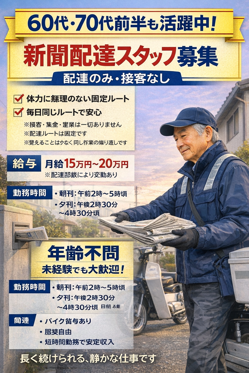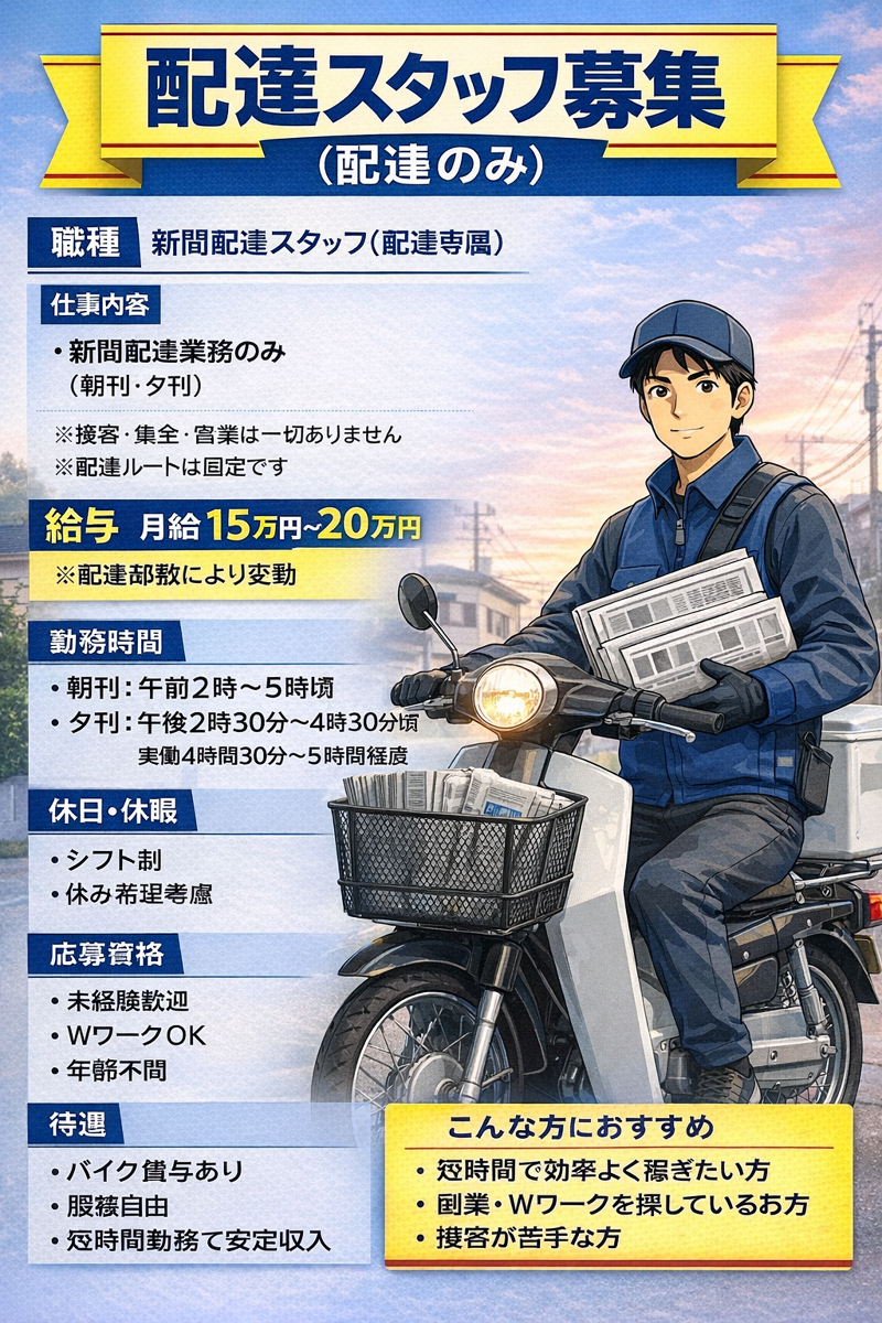 仕事内容: 仕事内容(配達スタッフ/配達のみ) ・新聞配達業務のみ (朝刊・夕刊) ・決まった担当エリアへの配達 ・毎日同じ配達ルートなので安心です ※接客・集金・営業は一切ありません ※ノルマはありません ※覚える作業は少なく、同じ作業の繰り返しです 未経験の方でも、 最初は先輩スタッフが同行し、 配達方法やルートを丁寧にお教えします。 体力に無理のない配達ルートを設定しています。 長年続けているスタッフも多く、 安心して働ける仕事です。