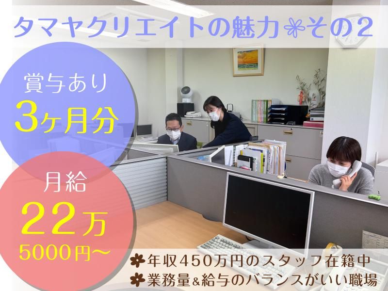 仕事内容 / “契約社員”ですが、 待遇は想像以上!! \ ✅月給22万5000円~25万円 ✅賞与年2回(計3ヶ月分) ✅昇給あり/育成担当制度あり ✅交通費支給(上限5万5000円) ✅土日祝休み/年間休日129日 ✅9:00~17:30(実働7.5時間) ✅過去10年以上、残業ゼロ ✅有給取得率100% 今回は将来の世代交代も 見据えた育成枠募集です。 「契約社員=不安定」 そんなイメージを くつがえす好待遇で ご応募お待ちしております。 先輩は今年で18年目。 基本的に更新前提で 長く続けられる環境です。 *** ビル賃貸会社での 落ち着いたオフィスワークです。 具体的には ・仕分け入力 ・請求書送付(平均1日3件) ・支払い対応(平均1日3件) ・電話応対(取次ぎ中心) ・管理会社への連絡(メール他) ・来客対応(お茶出し) ・入金確認 ・備品管理 ・郵便局への外出 など。 Excel・Wordは 入力ができればOK! 関数スキルは不要です。 未経験の方、 ブランクのある方も歓迎。 業務はすべてお教えします。 「派手さより、安定。」 「忙しさより、安心。」 そんな働き方を求める方へ。 契約社員という形ですが、 待遇も環境も、 胸を張っておすすめできます。 まずは一度、お話ししませんか。 *** 【タマヤクリエイトについて】 1937年創業。 不動産賃貸会社として 心斎橋・元町エリアなど 大阪・神戸中心部の一等地に 自社ビルを7棟所有し、 管理・運営しています。 “借りて運営する会社”ではなく、 “資産を守り、活かす会社”です。 だからこそ、 景気に大きく左右されにくく、 堅実な経営を続けてきました。 派手な拡大ではなく、 着実に積み上げてきた実績で 役員含めで7名の少数ながら、 長年黒字経営を継続。 18年勤務のスタッフが いることも会社の安定性と 働きやすさの証です。 ちゃんとした会社で 安心して働きたい。 そんな方にこそ、 自信を持っておすすめできる 環境になります。