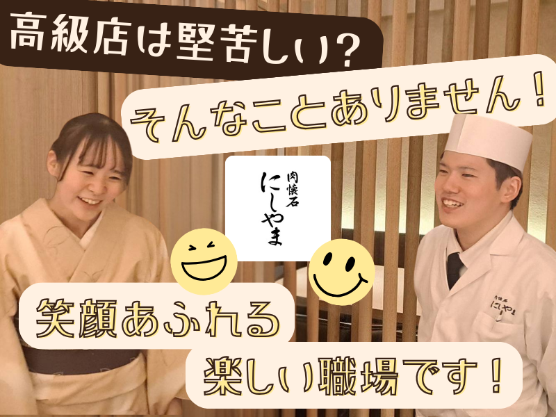 仕事内容 全席個室・完全予約制の落ち着いた肉懐石店【にしやま】。 着物で働ける「ちょっと特別なバイト」ですが、堅苦しさはありません。 ーෆーෆーෆーෆーෆー 駅から徒歩3分の好立地 週1~OKの自由シフト 22時までで終電も安心 全席個室・完全予約制 着物がかわいいと人気 ーෆーෆーෆーෆーෆー 春に向けてスタッフを募集! ※酒類提供があるため 20歳以上 の方のみ応募可能です。 【あなたに任せたいお仕事】 ――――――――――――― ෆお客様のご案内 ෆオーダー取り ෆ料理やドリンクの提供 ෆ片付け ෆレジ対応 など 静かな個室空間で、 “丁寧だけど堅すぎない”接客が自然と身につきます。 着物で働くのが初めてでも大丈夫。 スタッフからも「かわいい」「テンション上がる」と好評です。 【入社後はここからスタート】 ―――――――――――― まずは、 「いらっしゃいませ」 「こちらへどうぞ」 「ありがとうございました」 この3つが言えればOK。 最初は簡単なご案内や配膳からスタート。 ゆっくり覚えていけるので、未経験でも安心です✨ 【職場の雰囲気】 ―――――――――――― ෆ20〜50代まで幅広く活躍 ෆアルバイトは現在2名 ෆ静かで落ち着いた店内 ෆ丁寧な言葉遣いが自然と身につく 「落ち着いた接客がしたい」 「ガヤガヤしたお店は苦手」 そんな方にぴったりです。