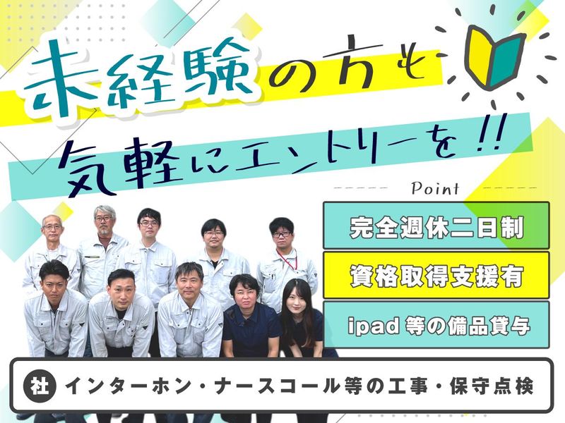 仕事内容 【求人のPOINT!】 ✨業界トップクラス企業の正規代理店 ✨住宅や病院に欠かせないから安定経営 ✨未経験歓迎&資格取得は会社全額負担 ✨賞与年2回!【年収560万円以上可能】 ✨完全週休2日制&年間休日115日 ✨入社後2~3ヶ月は先輩が同行して教育 ✨社内のテスト機で訪問前にテストできる ✨複数名のチーム制なので未経験でも安心 ・・・・・・・・・・・・・・・・・・・・・・・・・・・・・・・・・・・・・・・ インターホン、ナースコールで 業界トップクラスの東証プライム上場企業 アイホン株式会社の代理店として 修理・点検を担当している会社です。 アイホン株式会社と直接契約しており マンションや病院に不可欠な設備なので 景気にまったく左右されません! しかも入社後に 第二種電気工事士や消防設備士の 資格取得費用を全額会社負担! 社内研修も実施して取得をバックアップ! キャリアアップできる超安定企業です♪ ・・・・・・・・・・・・・・・・・・・・・・・・・・・・・・・・・・・・・・・ ⏩仕事内容⏩ ✅業務スケジュールの確認 ✅社用車でお客様を訪問 ✅定期点検・メンテナンス ✅新規工事・リニューアル工事 ✅日報作成などのデスクワーク、等 \工事・点検はチームで動きます/ 訪問エリアは福岡と佐賀がメインで 1日あたり2件~5件程度を回ります。 訪問先はすべてアポイント済みで ipadでスケジュールを確認できます。 点検は大規模のマンションや病院が中心。 使用中の機器に異常がないか点検します。 工事は新しいマンションでの設置工事や 機器が古くなり修理もできなくなると マンションのインターフォンや 病院のナースコール一式を交換する 全体のリニューアル工事を行います。 日数は数日から数週間かかります。 また社内にテスト機があるので 訪問する前に工事・点検する 機器をテストしてから現場に行けます。 ・・・・・・・・・・・・・・・・・・・・・・・・・・・・・・・・・・・・・・・ ⏩1日の流れ例⏩ 出社後、ipadで1日のスケジュールを確認 ▼ 複数名で社用車に乗り合って現場に出発 ▼ 工事や保守点検の現場作業 ▼ ランチタイム 事務所では飲み物を準備しています ▼ 工事や保守点検の現場作業を再開 ▼ 事務所で講習会を行う日も ▼ 事務所でデスクワーク ▼ 次の日の準備をして帰宅 ・・・・・・・・・・・・・・・・・・・・・・・・・・・・・・・・・・・・・・・ ⏩教育について⏩ 入社後2~3ヶ月は先輩に同行して 最初は比較的簡単な修理業務からスタート! 慣れてきたら先輩がサポートしながら 少しづつ工事・点検をお任せしていくので 未経験の方も安心してご応募ください! ・・・・・・・・・・・・・・・・・・・・・・・・・・・・・・・・・・・・・・・ ⏩メーカーとの共同研修が年4回⏩ 新商品の研修や機器内部の詳しい仕組み、 動作原理など一般的な電気工事会社より 深く専門的な知識を習得できるので 将来的なキャリアアップに繋がります! ・・・・・・・・・・・・・・・・・・・・・・・・・・・・・・・・・・・・・・・ ⏩プライベートも充実⏩ 休日は完全週休2日制で平日1日と 土曜・日曜のどちらか1日がお休みです。 基本的に希望通りに休みが取れるので お子様の学校行事の休みも対応可能! 金土や日月など連休も取りやすいので、 旅行や家族との予定も立てやすいですよ。 ・・・・・・・・・・・・・・・・・・・・・・・・・・・・・・・・・・・・・・・ ⏩職場環境⏩ 現在、代表を含めて男性4名・女性2名。 現場ではお客様から「ありがとう!」と 直接言ってもらえることも多く 誰かの役に立っている実感が湧いてきます。 福岡のオフィスは移転してまだ4年目。 デスクや家具も新しく広々キレイです♪ なんと軽食やドリンクを1つ50円~で提供。 おやつタイムに困らず好評です! ちなみに会社の飲み会は年1~2回くらい。 飲み会で社員の時間の奪いません◎ ・・・・・・・・・・・・・・・・・・・・・・・・・・・・・・・・・・・・・・・