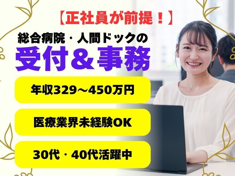 お仕事内容 <お仕事内容> ◎大手企業関連の総合病院で 人間ドックの受付窓口での受付と事務をお願いいたします。 ●受付窓口での受診者対応…オプション検査追加、当日窓口の支払対応、受診票の内容説明 ●確認業務…健診受診後の検査漏れの確認、当日の受診データの集計 ●経理業務…当日窓口支払の集計及び報告 【ご登録内容を確認後、ご紹介可能な場合のみご連絡いたします。ご応募いただいたお仕事以外にも、複数のご紹介が可能な場合がございます。応募フォームの「備考」欄よりご希望の職種(業務内容等)をお知らせください。】 【直接雇用後の条件】 雇用形態:正社員 想定年収:330万円~450万円 福利厚生:社保完備/賞与あり/昇給あり/退職金あり ※労働条件の詳細は紹介時にお伝えします。