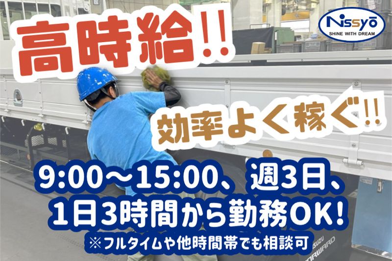 【アピールポイント】 【新車トラック磨きの専門スタッフ募集】 ■9~15時、週3日、1日3時間~勤務OK ■車好きな方必見!特殊車両も担当できる ■体を程よく鍛えたい方にもオススメの仕事