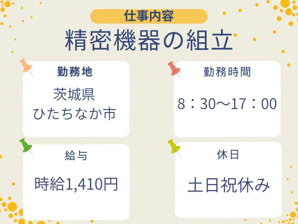 仕事内容 ✅土日祝休み×日勤 ✅しっかり稼げる♪ ✅20~40代の男性活躍中 - 【具体的には…】 ◆組立 ・電動ドライバーを使用します ・部品の組付け作業です ◇作るのは…医療用機械に使用する遠心分離機です ・経験豊富な先輩が丁寧に教えてくれるので安心♪ ◇何らかの製造業の経験があればOK ・電動ドライバーの使用経験ある方大歓迎♪ - \\ 大手じゃないからできる“近さ”と“柔軟さ” // 大手派遣会社だと「なかなかすぐに相談しづらい…」なんて声も。 でも当社は全く違います! ★ 担当営業が少人数だから、1人ひとりにしっかり向き合える ★ 都合や希望に合わせて柔軟に対応 ★ 気軽に相談できる雰囲気 “大手では味わえない距離感”で安心して働ける環境を作っています✨