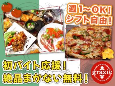 仕事内容 グラッツェ=「ありがとう」。 『ありがとう』の気持ちで溢れた オシャレダイニング「グラッツェ」で、 ホール(接客)のお仕事をお任せします! ホールSTAFFとして美味しい料理を 素敵な接客をお客様にお届けしましょう! 【具体的なお仕事は】 お客様のご案内や料理のご提供、お会計、 予約の受付など、一般的な飲食店での接客のお仕事です。 まずは簡単なお仕事から始め、お客様に喜んでいただける 「接客スキル」を徐々に身に付けることができます! また、誕生日や記念日などお祝い事のサプライズをする機会も多いため、 サプライズのお手伝いなど、いつもとは違った接客を楽しめます! 先輩スタッフがそばでサポートするので、 未経験の方も安心してご応募くださいね! \グラッツェの「ココ」がイイ!!/ [1]バイトデビューにもオススメ! 学生・フリータースタッフが中心に活躍中! 未経験から始めた同年代のスタッフが多く、 スタッフ同士の仲の良さもバッチリです* お仕事は簡単なことからお任せするので、 初バイトの方も安心です! [2]シフト自由! 週1日~、1日3時間~シフト相談OK! 日数や曜日、時間帯なども希望をしっかり考慮しますので、 自分らしく働くことができるお店です。 学校や遊びの予定と両立がしやすく、 学生さんやフリーターさんなど20代が大活躍中です! [3]オシャレも楽しめる! 20代のスタッフが多いグラッツェでは、 オシャレを楽しんでいる人も多数! 髪色もピアスも自由です! 制服もカワイイ&オシャレだと大好評* バイトを始めるから黒染めをしなきゃ・・・ なんて心配もしなくても大丈夫ですよ。 (「清潔感」だけは大切にお願いします!)