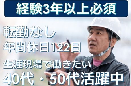 資格 直近1年以内の弊社への応募がない方 年齢不問・高卒以上 <必須>土木施工管理の経験が直近5年以内に3年以上、もしくは10年以上の実務経験(その場合ブランク不問) ★資格保有者優遇 ★経験3年以上の40代・経験5年以上の50代・経験10年以上の60代活躍中 【具体的には】 以下の方にピッタリ! ◎残業少なめにしたい ◎サポート体制が充実し、労働時間が徹底管理された職場で働きたい ◎スキルやキャリアを磨きたい ◎腰をすえて働きたい ★知識が活かせます ・施工管理・施工図・CADオペレーター経験者 ・技能工経験者 ・設計・監理・積算(意匠、構造、設備、電気、プロセス設計等)経験者 ・建築系、電気系、機械系、土木系学科卒の方 ★下記資格保有優遇!手当も充実 建築・管工事・電気工事・土木施工管理技士 建築士 建築設備士