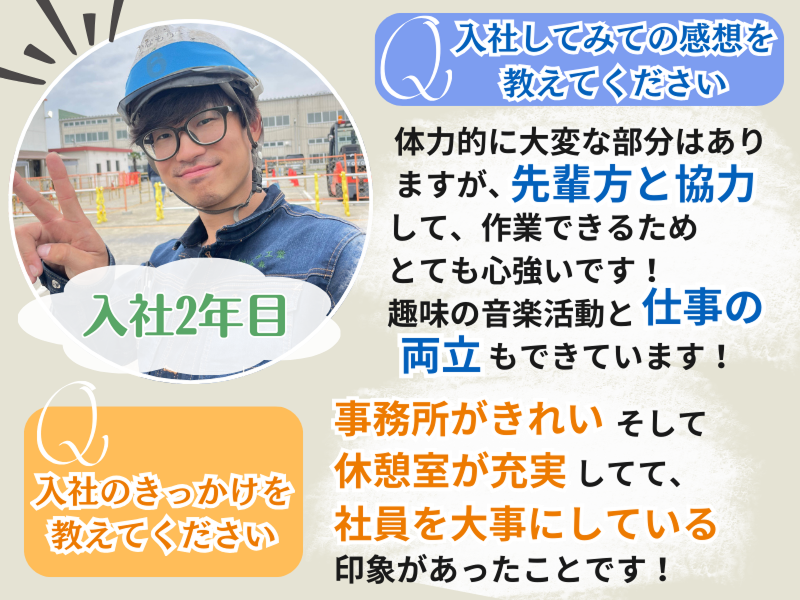 仕事内容: \未経験 × 年収400万円以上/ 先輩もみんなゼロからスタートしています! 「体を動かすことが好き」 「とにかく元気が取り柄!」 当てはまる方は適性あり◎ 入社後は半年かけて研修を行います。 安全第一で基礎から学べるため 現場職が初めての方でも安心! ----------------------------------- ⭐入社祝金20万円あり! →入社半年後に10万円・1年後に10万円支給! ⭐社宅・引っ越し支援あり! →遠方からの応募も大歓迎! ⭐年間休日125日&土日祝休み! →プライベートも充実! ----------------------------------- 【仕事内容】 ごみ焼却場やリサイクル施設など、 “私たちの暮らしを支える設備”を作り、守るお仕事です。 ▼メンテナンス業務 主に四日市市内のクリーンセンターや 三重県内のごみ焼却施設などを担当します。 ▼新設工事業務 新規案件の計画から施工まで一連を行います。 案件次第では出張が発生することもあります。 ====とある日の1日の流れ==== ※四日市市クリーンセンターへのメンテナンス業務の場合 ♦6:30 会社に集合 会社の車で現場まで移動 ※現場の駐車スペースが限られているので、 6~10人で移動することが多いです! ♦7:30 現場着・朝礼まで自由時間 ※余裕をもって早めに到着しているので、 作業開始まではプライベートの時間です! 朝ごはんを食べたり、スマホを見たり 各々自分の時間を過ごしています♪ ♦8:00 朝礼・MTG・業務開始 当日の流れや共有事項の伝達などを行います。 ♦10:00/12:00/15:00 休憩 昼食は多くのスタッフが持参した弁当や コンビニなどで購入しています。 ♦16:50 片付け・着替え・現場撤去 ♦18:00 会社に戻り、退社 ======================== «入社後の流れ» 最初は先輩に同行して、 現場の流れを覚えるところからスタート! 半年かけて丁寧に、安全に研修を行います。 <1か月目> ・安全に対する教育(1週間~10日ほど) ・工場内で工具の使用レクチャー(1週間ほど) ・溶接の練習(1週間ほど) <2か月目> ・メテナンスチーム研修 <3か月目> ・新設工事チーム研修 <4か月目以降> メンテナンスチーム or 新設工事チーム 今後どちらを頑張っていきたいかをヒアリング。 その後は個々の方向性に合わせて、 より密度の濃い研修を行います! ----------------------------------- ✅当社は一次下請け企業です! クライアントから直接工事を受注するから… ♦急な現場変更ほぼなし! ♦1~2年先まで余裕あるスケジュール♪ ♦プライベートの予定も立てやすい環境!