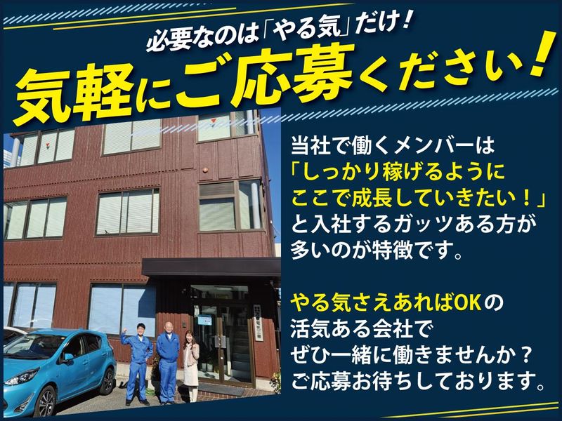 職場環境 とにかく「ここでしっかり稼げるようになりたい!」で入社してくるガッツあるメンバーが多いです。やる気さえあればOKの活気ある会社で、一緒に働きませんか?
