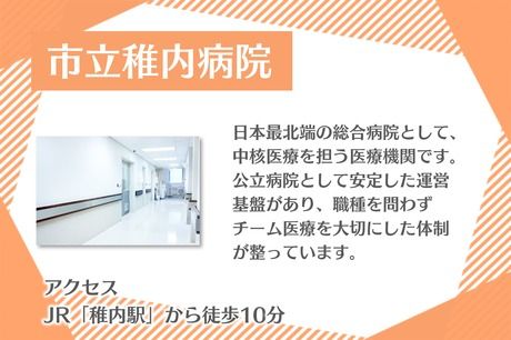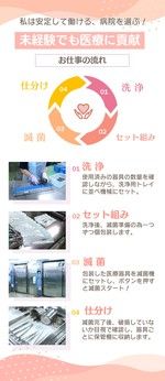 仕事内容 市立稚内病院内でのお仕事です。 使用済みの医療器具の滅菌作業をお願いします。 ■未経験から始める安定シゴト ★未経験OK ★資格なしOK ★学歴不問 患者さんの治療を行う際に、様々な器具を使用します。ガーゼや注射針のように使い捨てのものもありますが、繰り返し使用する器具もあります。 繰り返し使用する器具は、きれいに洗浄・滅菌作業を行わないと、患者さんの治療を行えなかったり感染症を引き起こす可能性があり、治療することができません。 病院を正常に機能するために大切な「縁の下の力持ち」としての役割を果たしています。 清潔な医療器具を提供することで、確実に患者さんの役に立っていること・医療に貢献できていることを実感することができます。 ■直接雇用の実績No.1 当社では求職者様の「雇用の安定」を第一に考え、直接雇用への切り替えを積極的に行っております。 当社が一番の実績数を誇っており、実際に約30名の方が、派遣→直接雇用へとステップアップ。 ■土日祝休み そして、長く働くにはお休みやモチベーションも大切。 土日祝や大型連休は、しっかり休んでリフレッシュしましょう。 有給休暇は取得しやすいように、オンラインでの申請も可能です。 ■昇給あり 病院なので年間のスケジュールも決まっており、毎月の給与も安定。 昇給制度もあり、頑張った分は評価されます。 ■女性が活躍できる職場と厚生労働省に認定された「えるぼし」認定企業です ★えるぼしとは? 女性の活躍促進に関する取組の実施状況が優良な企業に対して、厚生労働大臣が認定する制度です。 今後もより一層女性の活躍促進を取り組むとともに性別や働き方に関わらず一人ひとりが最大限に能力を発揮し活躍できる環境づくりに取り組んでまいります。 仕事内容について ■医療器具の滅菌 治療や診察で使用するピンセットやハサミ等、使用した医療器具・器材を滅菌するお仕事内容です。 1.洗浄 使用済みの器具の数量の確認を行いながら、洗浄用トレイに並べます。 トレイを専用の機械にセットし、洗浄から乾燥まで行います。 器具によっては手洗いする物もあります。 2.セット組み 滅菌準備のため、医療器具を一つずつ個包装します。 器具や使用用途によって包装方法が異なるため、一つずつ覚えていきましょう。 3.滅菌 包装した医療器具を滅菌機にセットします。 ボタンを押すと自動で滅菌がスタートします。 4.仕分け 滅菌完了後、破損していないか目視で確認し器具ごとに仕分けし決められた棚に収納します。 以上の仕事を一人で全て行うわけではなく、作業ごとに分業制になっています。 慣れるまでは先輩と一緒に作業を行うので、順番にお仕事を覚えていきましょう。 医療器具の名前やお仕事のルール等覚えることはたくさんありますが、覚えてしまえば繰り返しのモクモク作業になります。