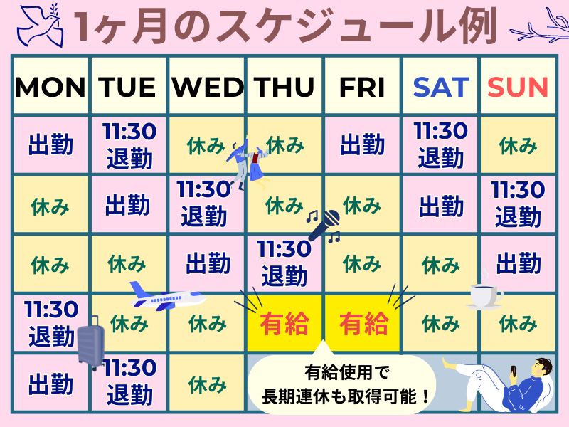 勤務時間詳細 総労働時間:1ヶ月あたり150時間15分 〜 171時間 10:30~翌11:30(実働時間20時間45分) (休憩4時間15分※仮眠含む) ~1日の流れの一例~ 10:30 出勤・制服に着替える 11:00 朝礼・引継ぎ・予約数の確認など 15:00 チェックイン対応・フロント対応 24:00 仮眠・休憩 04:00 ロビー設置のアメニティ補充 06:00 朝食会場のお手伝いなど 08:00 チェックアウト対応・引継ぎ 11:30 退勤 <その他> 月1回フロントミーティングあり ▶10:00~16:00(休憩1時間) ※無料で昼食も提供されます。