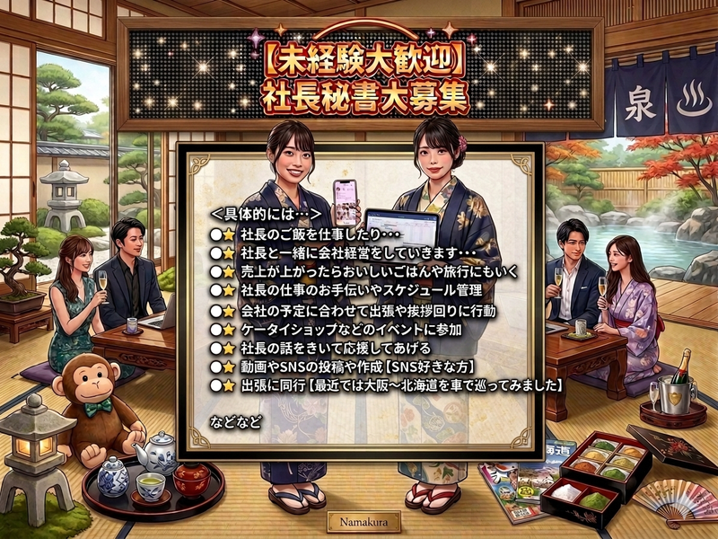 求める人材: <社長から一言> * ◆◆弊社の企業理念◆◆ 『人に喜ばれてこそ会社は発展する』 弊社のグループは、もともと2015年に1人で立ち上げた会社で、 初めは自分で作成した求人チラシを大学や駅の前で配ったりしておりました。 その当時はケータイイベント会社が少なく業界としては若い業界になります。 今では社員やアルバイトの方たちに支えられて、常時700人ほどスタッフが在籍する会社にまで成長してきました。 その理由として、当たり前かもしれないですが、 接客業としてお客様に喜んでもらったり、1つの会社として取引先やスタッフ達、 その家族に喜んでもらったりしたいと常に思っており、その当たり前を日々忘れず取り組んできました。 給料体系やサポート制度、研修制度もスタッフの意見で取り入れました その結果、ここまで大きい会社に成長させることができたのではないかと 感じたので、この言葉を企業理念としました。 色々な仕事がある中でうちで働いてくださって本当にありがたく思ってます! このお仕事は、学生時代にクラブ活動でマネージャーをしていたような方にピッタリ。 実際にマネージャー経験者が多く活躍しています。 でも、ご安心ください! 経験がなくても「やってみたい!」という気持ちがあれば 全力でサポートします。 笑顔で働くスタッフを見るたびに心から嬉しく思います。 未経験で不安な方にも、働く前から働いた後までしっかりとフォローします。 安心の『1対1』お仕事教育制度を導入しているので あなたに合った先輩が丁寧に指導します。 これが、お仕事が長続きする秘訣です! お仕事内容に心を込めてお伝えしますので、ぜひ一度ご覧ください。 オススメ福利厚生【一例】 ・社宅制度 会社が家賃を負担します ・長期休暇制度 ・2週間連続休暇OK【1年勤務後】 ・毎月目標達成ボーナスあり 接客経験者は事務が初めてでも本当にOK! なので、 こんな方にオススメです! 学生時代にスポーツしてた方優遇 ①接客経験があるけど、事務経験がなくて事務のお仕事も経験してみたい方 【接客と事務の両方できるのでオススメ】 ②出来ることを増やしたり、成長して給料をたくさん稼いだり将来起業したい方 【性格にあった育成カリキュラムがあるので選べます】 ③同じ場所で同じことを繰り返すより色々なことをしたい方 ☆★☆★☆★☆★☆★☆★☆★☆★☆★☆★☆★ さらに!! * ❶お仕事をして成長したい気持ちの強い方 * ❷お仕事を楽しみたい方 * ❸自分の評価でお金をしっかり稼ぎたい方 * ❹たくさんお仕事働きたい方 * ❺約束をしっかりと守る方 * ➏働く体力に問題ない方 * ❼報告 連絡 相談が出来る方 □■□■□■□■□■□■□■□■ * ★1つ当てはまるごとに採用確率が5%します★↑↑ * ★経験したことや持っていると良いスキルや趣味・能力★