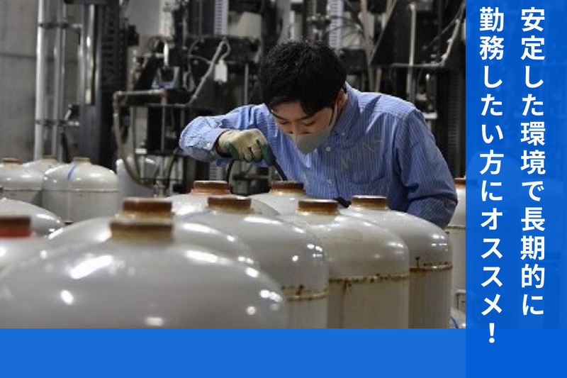 仕事内容 ニチガスグループの工場で LPガスボンベの検査場にて、 シンプルな軽作業や 機械操作をお願いします。 ◎時給1600円~ 週5日勤務で月収22.4万円も可 ◎正確かつ丁寧に作業できる方が 活躍中の現場です! ◎20代~50代まで、未経験者も 活躍しています。 《 当社について 》 日本瓦斯株式会社(ニチガス)は、 1955年設立の総合エネルギー企業。 LPガス・都市ガス・電力販売を展開し、 皆様の暮らしを支えています。 知名度と安定性を兼ね備えた 事業基盤も当社の魅力です。 LPガスボンベの検査は、 安全な供給を支える重要な工程。 責任ある仕事だからこそ、 社会に貢献できる実感があります。 ──────────────── LPガスボンベの法定検査を通じて、 安全なガス供給を支えています。 生活インフラを担う企業の一員として 一つひとつの確認が 人々の安全を守る責任ある業務です。 《 主な業務内容 》 1人1工程担当/マニュアル完備 ①ガス抜き作業 ボンベ内のガスを抜き取ります ↓ ②内部チェック ボンベ内部の状態を目視確認 ↓ ③外観チェック 塗装をはがし、表面状態を確認 ↓ ④バルブ取り付け・PC操作 バーコードラベルの貼付など ↓ ⑤最終チェック ボンベの仕上がりをチェック ボンベはコンベアで流れるので、 重いものを運ぶ作業は ほとんどありません。 ひとつひとつの作業はシンプルなので お仕事が覚えやすい点もメリット◎ ──────────────── 《 注目POINT 》 ✨ 時給1600円! *生活基盤を支える 安定収入が可能。 週5日勤務なら、月収22万4000円が 可能です。 安定した収入を確保したい方に オススメです。 ✨快適な職場環境 *工場内に飲料・軽食の自販機あり! 手ぶらでも出社が可能です。 *働きやすさにこだわった作業環境 新しい工場で、 快適に作業に取り組めます。 *車・バイク通勤OK