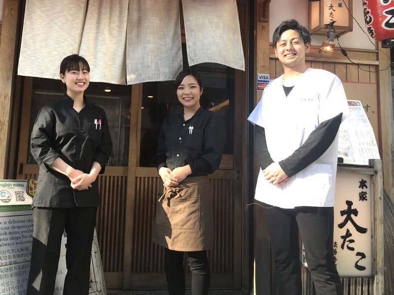 仕事内容 \ 老舗のたこ焼き屋での店舗スタッフ!長期歓迎/ 週3日~OK!シフト相談可! < ホール > 〇お客様のご案内 〇オーダー取り 〇お料理の提供 など。 < キッチン > 〇調理補助 〇カンタンな盛付け 〇ドリンク作り など。 …………………………………………………… 【 頑張りは見逃しません! 】 「接客がよくなった」 「きれいな盛り付けができるようになった」 「ミスが少なくなった」 …そんなあなたの頑張りはしっかり評価! スキルアップすればするほど 寸志や昇給でしっかり還元いたします♪ …………………………………………………… 【 たこ焼き屋「本家 大たこ 道頓堀店」 】 昭和47年、大阪道頓堀の粉門激戦区で屋台からスタートした当店。 ぶつ切りのでかい大たこを使った秘伝だし香るたこ焼きを求め、連日多くのお客様が列をなす繁盛店へと成長しました!