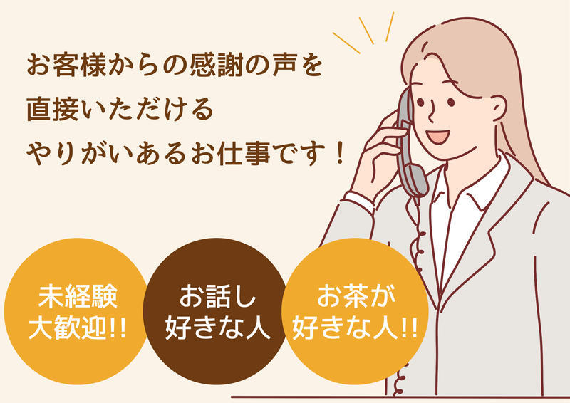 仕事内容 ――――――――― 事務職 急募 ――――――――― ハイレベルなスキルは必要なし。明るく丁寧な対応ができる方を歓迎しています! 【仕事内容】百年茶を電話でご注文いただくお客様への対応がメインです⭐ ・お電話での百年茶のご注文受付 ・専用ソフトへの顧客データ入力 ・配達業者さんへの対応、等 ※複雑な業務はありません ――――――――― 丁寧に教えます ――――――――― 業務はもちろん、商品についてや困った際は、現職のスタッフが丁寧に教えますのでご安心ください⭐ ――――――――― 当社について ――――――――― 私たちは岩手県一関市で、和漢草を配合した「百年茶」をお届けしている会社です。 一関の厳しい寒さの中でも、一杯のお茶で体がポカポカと温まり、心が解きほぐされる。そんな「日常の小さなしあわせ」と「健康」を守り続けています。 ■ホームページ https://hyakunencha.shop/