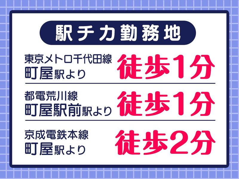 交通・アクセス 東京メトロ千代田線「町屋駅」より徒歩1分、京成電鉄本線「町屋駅」より徒歩2分、都電荒川線「町屋駅前駅」より徒歩1分 ★自転車通勤OK