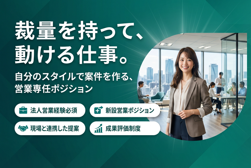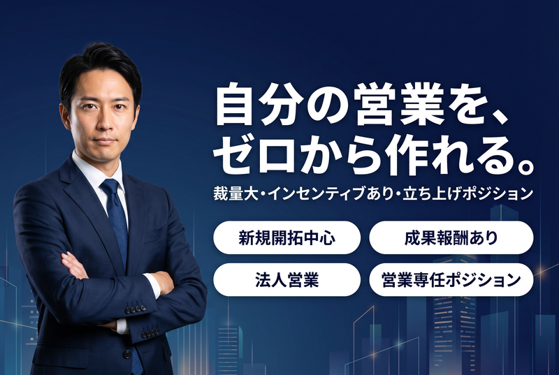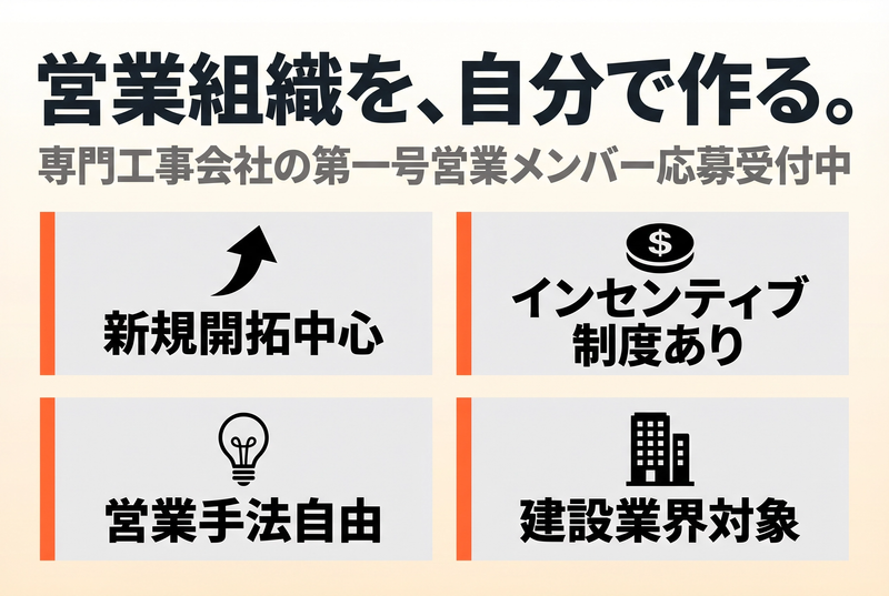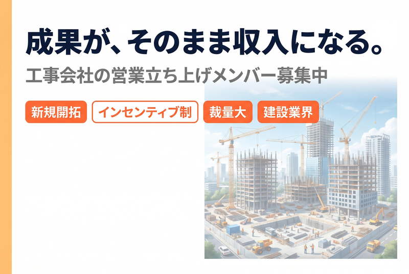 仕事内容 \ 営業を“自分で作れる”環境 / \ 成果がそのまま評価につながる / ―――*―――*―――*―――*――― 【この求人のポイント】 ・営業専任ポジション(立ち上げ) やり方を自分で構築できる ・新規開拓中心 裁量大きく自由度高い ・インセンティブあり 成果に応じて収入アップ ・現場と連携した提案営業 営業力が磨ける環境 「もっと裁量を持って営業したい」方へ ━━━━━━━━━━━━━━━━━━━ 仕事内容 ━━━━━━━━━━━━━━━━━━━ 新規顧客の開拓を中心に、 工事案件の獲得を行う営業です。 <具体的には> ・新規顧客の開拓 ・現場情報をもとにした提案営業 ・見積作成、受注対応 ・既存顧客フォロー(一部) 営業先は民間企業が中心です。 現場と密に連携しながら、 自ら案件を作り出す営業スタイルです。 <入社後> 現場理解のため、 一定期間は現場業務も経験していただきます。 その後、営業として活動していただきます。 ━━━━━━━━━━━━━━━━━━━ 営業スタイル ━━━━━━━━━━━━━━━━━━━ ・新規開拓中心 ・自分で営業手法を構築可能 ・裁量大 決まったやり方はありません。 ━━━━━━━━━━━━━━━━━━━ 評価・報酬 ━━━━━━━━━━━━━━━━━━━ ・新規案件にインセンティブあり ・成果に応じて収入アップ 頑張りがしっかり評価される環境です。 ━━━━━━━━━━━━━━━━━━━ 求める人材 ━━━━━━━━━━━━━━━━━━━ 【必須】 ・法人営業経験 【歓迎】 ・新規開拓営業の経験 ・建設、土木業界の知識 【こんな方に向いています】 ・裁量を持って営業したい方 ・自分のやり方で結果を出したい方 ・成長意欲が高い方 ━━━━━━━━━━━━━━━━━━━ 会社について ━━━━━━━━━━━━━━━━━━━ 当社は専門工事を手がける会社として、 現場力に強みを持っています。 営業は今回新設のため、 ゼロから営業組織を作っていくフェーズです。 自由度の高い環境で、 自分の力を試すことができます。 ━━━━━━━━━━━━━━━━━━━ 募集背景 ━━━━━━━━━━━━━━━━━━━ 事業拡大に伴い、 新規案件獲得を強化するための募集です。 営業の立ち上げメンバーとして、 主体的に動ける方を求めています。