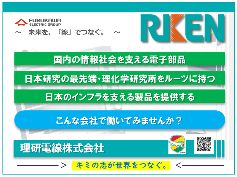 仕事内容 ✼┈┈┈┈┈この求人のPoint┈┈┈┈┈✼ ✅ 品質を守る、モノづくりの要 ✅ 市島工場(丹波市)での限定採用 ✅ 年間休日121日(土日祝) ✅ 月給21万~26万円以上 ✅ 住宅費補助など福利厚生◎ ✅ 不良チェック・特性評価を担当 ✅ 傾向分析で製品改良に貢献 ✅ 古河電工グループの安定感 ✼┈┈┈┈┈┈┈┈┈┈┈┈┈┈┈┈┈✼ |◤具体的な仕事内容 ◢| 完成した製品が仕様通りに 作られているかチェックし、 評価・分析を行うことで、 より良い製品づくりを支えます。 ・製品の不良チェック(外観等) ・製品特性の評価・試験 ・データの傾向分析、統計管理 ・評価結果に基づく、 製造部門へのフィードバック 1日の流れ(とある技術スタッフのある1日)  ̄ ̄ ̄ ̄ ̄ ̄ ̄ ̄ ̄ ̄ ̄ ̄ ̄ ̄ ̄ ̄ ̄ ̄ ̄ 8:30~ 出勤 ▼ 9:00~ スケジュール確認・前日の続き ▼ 9:30~ 品質保証部門との品質会議 ▼ 10:00~ 顧客問い合わせへの回答(メール・電話) ▼ 11:00~ 来客(材料メーカーと打ち合わせ) ▼ 12:00~ お昼休憩(昼食) ▼ 13:00~ 試作品製造及び実験・検査 ▼ 15:00~ 社内会議 ▼ 16:00~ 書類作成(仕様書など) ▼ 17:15 退勤 ⭐当社の特徴について⭐ 理研電線株式会社は、 1934年創業の老舗 電線・ケーブルメーカーです。 当社は理化学研究所の研究成果を 工業化する為に設立された会社で、 戦前はこの理研コンツェルン、 戦後は古河電工グループとして活動してきました。 現在は古河電工グループ の安定基盤のもと、 太陽光パネル、スマホ、LED照明といった 製品内部の電子部品を 国内トップクラスのメーカーとしてつくり 社会インフラや 情報インフラを支えています。 スマホや太陽光パネルなど、 品質を守る「最後の砦」として 一緒に働きませんか? ✅《製品を「科学」する面白さ》 単なる検査に留まらず、 「なぜこの数値が出たのか」 を分析し、より高品質な 製品づくりのための指針を 示す。あなたの分析が 理研電線の信頼を作ります。 ✅《未経験でもOK!安心の教育体制》 理系知識があれば実務 未経験でも大丈夫です。 検査機器の使い方から 分析のコツまで、先輩が 丁寧に指導するので安心です。 ✅《安定した生活基盤》 完全週休2日、年休121日。 住宅手当や家族手当も完備。 古河電工グループならではの 手厚い待遇が自慢です。