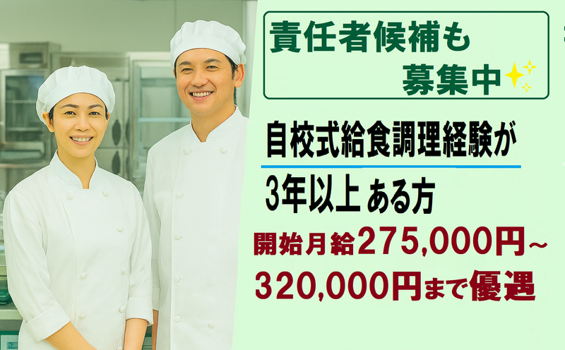 求めている人材 調理師免許をお持ちの方 ★実務未経験OK ★ブランクある方も大歓迎! 【経験ある方は必見!】 自校式学校給食の調理経験が3年以上の方ある方は責任者候補として優遇します。 責任者やリーダー経験はなくてOK!月給32万円まで優遇可能です。