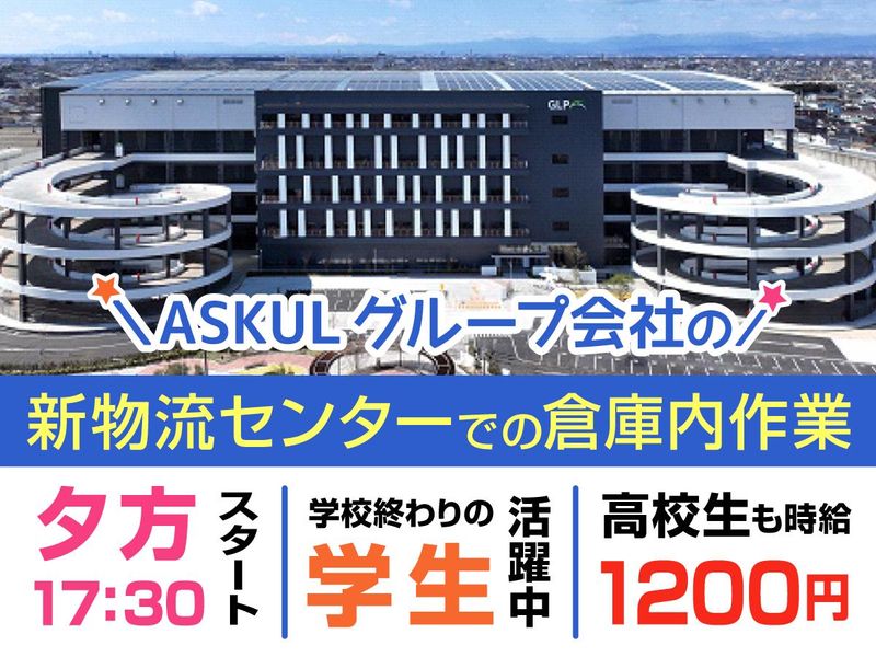 仕事内容 【2025年6月OPEN⭐最新物流センター】 学校帰りに安心して働ける、 アスクルグループのお仕事です。 ASKUL LOGIST株式会社は、 オフィス用品通販でおなじみ 「アスクル株式会社100%出資」の物流会社。 全国のアスクル物流を支える、 従業員3,500名以上の安定企業です。 今回勤務いただく 上尾物流センターは、 2025年に稼働開始したばかりの 最新・最大級の物流拠点。 ✅最新鋭のロボット設備! ✅免震構造で安全安心◎ ✅273台分の駐車場を完備! ✅休憩室・食堂完備♪ ⭐倉庫内は、ゆとりの設計♪ 広々とした通路は移動しやすく、 棚の陳列も見通しバツグン! ⭐高校生・学生さんも安心ポイント ・高校生も時給1200円(条件変更なし) ・テスト期間中は勤務日の相談OK ・夕方17:30~21:30/学校帰りにピッタリ ・マニュアル完備&研修ありで初バイトでも安心 実際に働くスタッフの声を公開しています。 ぜひご確認ください! ↓↓ https://www.shain-voice.com/corporate/549273100924933