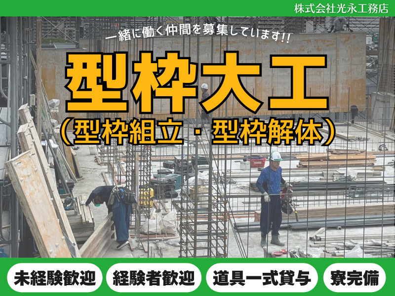 仕事内容 ◤◢◤◢◤◢◤◢◤◢◤◢◤◢◤◢◤◢ ⭐【正社員】型枠大工、大募集! ⭐ 建物の基盤を支え、街の未来を築く。 「形が残る」やりがいのあるお仕事です! ◤◢◤◢◤◢◤◢◤◢◤◢◤◢◤◢◤◢ 当社は、1981年に福岡市南区で設立された型枠工事専門の建設会社です。 福岡県内を拠点とし、宮崎、熊本、佐賀など幅広いエリアで施工を行っています。 今回は体制強化に向けて、新しい仲間を増員募集いたします! ※当社は、上村建設株式会社の協力会社で構成する組織「上栄会」の一員です。 工事施工および安全衛生管理の面で協力しながらともに成長を続けます。 ” https://www.u-buddy.net/ ” \\ お仕事ポイント // ⭕未経験から始められる! ⭕資格取得支援制度あり! ⭕会社ジャンパー・空調服・道具一式貸与 ⭕丁寧な研修・フォロー体制あり \\ 経験者も未経験者も大歓迎 // 作業着(会社ジャンパーや空調服)、工具一式は会社で支給します。 ”どんなものを用意したらいいかわからない…。” ”初期費用にお金をかけたくない…。” ”安物を買って現場で苦労したくない…。” そんな悩みを持つ必要はありません。事前準備は一切不要です! あなたの新しい挑戦をバックアップできる環境を整えてお待ちしております! 【 仕事内容 】 福岡県内を中心に宮崎、熊本、佐賀など 九州エリアの現場で、型枠工事を担当していただきます。 ●図面に合わせて型枠資材の加工 ●現場で型枠の組み立て・固定 ●コンクリートの流し込み ●型枠の取り外し ●準備・片付け作業 など ・。・。・。・。・。・。・。・。・。 <型枠大工とは?> 「大工」と言えば、”木造の家を建てる職業”を思い浮かべる方が多いと思いますが、 大工にも種類があり、「型枠大工」はそのひとつです。 その名の通り、建築物の「型」を作る仕事になります。 氷を作る型、プリンを作る型、の建築物バージョンです! // 型枠工事の3ステップ // <ステップ1:準備> 事務所で組み立てるための図面(設計図)を作り、資材を加工します。 <ステップ2:組立> 現場で型枠を組み立てます。 <ステップ3:投入> コンクリートを型枠に流し込み、固まったら型を外します。 この作業を繰り返し行っていきます! ・。・。・。・。・。・。・。・。・。 1人が全部を担うのではなく、チーム全体で協力して作業するので、 経験が浅い方や未経験の方もご安心ください◎ 高層ビルやマンション、橋梁やトンネルなど、 様々な現場でコンクリートを必要とする場所があります。 色んな現場に携わり、経験を積んでいきましょう! 自分の可能性を最大限に引き出し、新しい技術に触れるチャンスです★ 建物の基盤を支える大切な工程を担う型枠大工として、 経験者はもちろん、未経験から技術を身につけたい方も歓迎します。 私たちと一緒に、型枠工事の未来を担う仲間として成長していきませんか? まずはお気軽にお問い合わせください! ─────────────────── ⭐ 未経験からでも始めやすい教育体制⭐ ─────────────────── 最初は道具の名前を覚えたり、先輩に材料を運んだりすることから始まります。 難しい計算や高度な技術は、現場で働きながら少しずつ学んでいけば大丈夫です。 最近では、パソコンで図面を作る作業も増えているので、 体力自慢の方だけでなく、モノ作りが好きな方にも向いています◎ わからないこともすぐ聞ける環境なので、未経験でも安心してスタートできますよ! また、仕事をしていく中で身につく知識やスキルを活かして 取得できる資格が多数あります。 玉掛け技能講習、小型移動式クレーン運転、型枠施工技能士など 作業に必要な資格取得を全力で応援いたします! 資格取得費用は会社で負担しますし、 資格取得に向けた講習補助や取得後の資格手当もありますので、 キャリアアップを目指してチャレンジしてみてくださいね★ ──────────── ⭐ 在籍スタッフの声 ⭐ ──────────── まだ経験が浅い私ですが、先輩方に支えられながら成長を実感しています。 型枠大工は、ただ図面通りに型を組み立てるだけではなく、 現場の状況に応じて柔軟に対応することが求められます。 最初は難しく感じましたが、回を重ねるごとに少しずつ技術が身についていくのが嬉しいです。 また、型枠工事は建物全体の外観にも関わるため、 完成後に美しく仕上がった建物を見たときには、 達成感と共に自分の技術が反映されていることに誇りを感じます。 今後もさらに技術を磨き、プロとして胸を張れる型枠大工を目指しています。 ────────────── ⏩ 1日のスケジュール (例) ────────────── ▼ 8:00 朝礼 作業内容やスケジュールを確認します。 ▼ 8:30 作業開始 安全確認をして、図面をもとに組み立て(建込み)スタート。 ▼ 10:00 小休憩(30分) ▼ 12:00 お昼休憩(60分) ▼ 13:00 作業再開 パネルを固定したり、垂直かどうかの確認作業を行います。 ▼ 15:00 小休憩(30分)