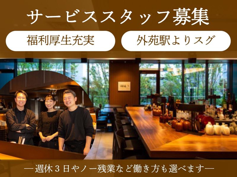 仕事内容 【 新着|求人のPOINT 】 *サービス経験必須(年数・業界不問) *飲食未経験の方も歓迎 *選べるノー残業制・週休3日制 *昇給随時・賞与あり *「外苑前」駅よりスグ *社割・各種手当など福利厚生充実 ━━━━━━━━━━━━━━━━━ 和食ダイニングでのサービススタッフ ━━━━━━━━━━━━━━━━━ 自家製蕎麦と信州地酒を 心ゆくまで愉しめる 和食ダイニング『川上庵』。 わたしたちが大切にしているのは お料理はもちろん、空間やサービス、 きめ細やかな部分まで。 ゆったりとしたジャズが流れる店内で、 より多くのお客様にご満足いただける サービスを提供しています。 今回は、そんな当店で サービススタッフとして ご活躍いただける方を募集します◎ 【 仕事内容 】 ■ご案内 ■オーダーテイク ■料理の提供 ■席の片付け ■お会計 ■備品の補充 ■店内清掃 など 入社後はホールの各ポジションに入り、 徐々にお仕事を覚えていただきます! 慣れてきたらドリンカーやパントリー、 レセプション(予約管理)なども お任せする予定です。 未経験の方や経験が浅い方には できることからお願いしますので 焦らずあなたのペースで 覚えてください* 【 川上庵について 】 酒の肴と日本酒、 冷えたせいろで締めるといった 江戸時代から暮らしに根付く 粋な食文化を現代に継承しています。 軽井沢に2店舗・都内に3店舗を 展開しています。 【 働き方について 】 飲食業界ではめずらしい <週休3日制>や <ノー残業制>を導入◎ プライベートも大切にでき、 ライフステージに応じて さまざまな働き方が可能なので 腰を据えて長く働けます!