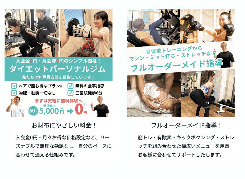 三宮パーソナルジム|28万円以上| 集客安定環境でトレーナーとしてキャリアを築ける |未経験可・経験者歓迎|指導に集中できる環境