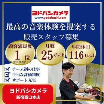 仕事内容 家電量販店部門の顧客満足度調査で16年連続首位!その秘訣は… ■ヨドバシカメラ独自の事業戦略 出店…都内、及び首都圏では ドミナント戦略による圧倒的認知が強み。 新宿・秋葉原・上野、そして池袋(2026年オープン予定)へ。 主要ターミナル駅前に超大型店を集中出店。 一目見て「ヨドバシカメラ」があることを 認知できる場所に狙って出店することで 認知度を高めると共に 駅を利用するついでに、 ふらっと立ち寄る集客戦略を実現することで 抜群の集客力と安定性を誇ります。 EC…ヨドバシドットコム ヨドバシカメラは 実店舗で生の接客を体験していただき 購入は後日ネットでも行っていただける 利便性を売りとしています。 また、「ヨドバシエクストリーム」は 即日配送を実現。 この実店舗とECサイトサービスの両輪から 高い顧客満足度と、安定した営業利益を 実現しています。 接客…お客様のお困りごとを解決する ヨドバシカメラが大切にしていることは、 ”お客様のお話を聴く”ということ。 お客様は特定のメーカーにこだわるというより 全てのメーカーをフラットに 検討したいという方が多い為 「ヨドバシカメラの店員は相談しやすい」と お声をいただけます。 だからこそ、お客様がどんな生活をしていて、 誰がいつ使うものなのか、 こだわりたいことはなにか・・等、 お客様のご要望をきちんと汲み取り、 その生活・趣味・志向に合わせて 商品を提案することが本当の価値だと考えています。 多くのお客様に”ヨドバシの販売員に相談してよかった”と 思っていただくとともに、 ”お客様の喜ぶ顔が一番見られる職業”を目指して。 ヨドバシカメラでお客様と会話する楽しさを やりがいとして、 新たなキャリアを歩んでいきませんか? あなたのイメージが覆るかも?!ヨドバシカメラならでの、”提案接客” \好きな音楽の話、しませんか?/ 「このヘッドホン、まるでライブ最前列みたい♪」 「この曲のベースラインを 聴くならどのイヤホン?」 お客様との会話は、まるで好きな音楽談議の延長線! お客様がどんな音楽を聴き、 どんな感動を求めているのか。 その「好き」に寄り添い、最高の”音楽体験”を叶える 一台を一緒に探すのが私たちの仕事です。 私たちの価値は商品を売ることではありません。 お客様の日常に、心震えるような 最高の音をお届けすること。 「あなたに相談してよかった!」 その一言とお客様の笑顔が、 最高のやりがいです◎ ■売り場の配属先 本人の希望や経験、売場の状況に応じて決定いたします。 ※必ずしもAV機器(イヤホン、スピーカー等) オーディオ関連売り場になるとは限りません。 ■販売員に閉じない総合職ならではのキャリアの幅 加えて「どんな仕事が自分に合っているか分からない」 そんな思いをもっている人に対して、様々なキャリアの選択肢をご用意しています。 事業を、店舗だけではなくECにも注力しているからこそ 将来、ECサイトや物流センターの運営に携わっていただく可能性もあります。 「ヨドバシなら、どの街でも安心」 新宿・秋葉原・上野・池袋…と広がる網羅性。 このドミナント戦略が、働くあなたの 長期的なキャリアを支える柱となります。 ヨドバシカメラでは、働きながら自分にあった仕事を考えていける環境です。 「これからのキャリアを見つめ直したい」 そんな風に思っている人は、ご応募お待ちしております。 面接当日はリラックスして、是非とも ありのままのご自身でお越しください。 売り場毎にチーム制を導入。聞きやすいことが聞ける、答えられる環境だから雰囲気◎ ■チーム体制 15~20名程度のチームで売り場を回しているため、 適宜サポートがしやすい体制です。 マネージャー、リーダー、一般社員から構成され チーム単位で朝礼を行います。 また、売り場毎に固定の配属としている為 先輩社員の知識が豊富なことも強みの一つ! 分からないことがあれば、すぐに聞ける環境ですし なにより、分からないことはほぼ100% その場で解消することができます。 好きなアーティストや最新機材の情報交換で 盛り上がることも日常茶飯事♪ 知識を活かしてお客様を笑顔にする最高のチームです! ■商品知識・接客のインプット 経験豊富な先輩社員がイチから丁寧にお教えします。 業務に慣れるまではマンツーマンでフォロー。 また、外部からの商品説明や 講習会等も継続的に実施しますので、 最新の商品知識も適宜インプットすることができます。 幅広いキャリアステップと、成果認定制度。 ■キャリアステップ 拠点の拡大はチャンスの拡大。 将来的には様々な部署・ポジションで勤務し 当社の経営を担っていただくような活躍を 期待しています。新卒・第二新卒・中途など 入社時の雇用区分は関係なくEC部門の強化に あたり物流・配送のお仕事もございます。 幅広いポジションと働き方による OJT制度を元にあなたのキャリアを 一緒に考えていきましょう。 ■独自の人材育成システム「成果
