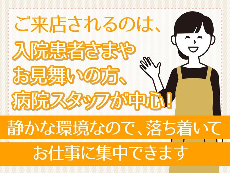 仕事内容 ★お仕事内容はシンプルで安心! 病院内の売店で レジや接客を中心にお任せします。 トイレ清掃や揚げ物調理、 公共料金の支払いなし! お酒やタバコの販売もありませんので、 無理なく始められます! レジもカンタン操作なので すぐ慣れていただけると思います! 店舗が小さめなので、 バタバタしすぎることもなく 落ち着いて働けます♪ ★快適で働きやすい職場環境 病院内の売店なので、 清潔感があり静かな環境で お仕事に集中できます! ご来店されるのは入院患者さんや お見舞いの方、病院スタッフなので 落ち着いて接客ができる♪ 「ありがとう」の言葉を 直接聞けるやりがいのあるお仕事です。 *・。*・。*・。*・。*・。*・。*・。 ★未経験でも安心! 難しい作業はなく、 先輩スタッフがしっかりサポート。 初めてのパートでも不安なくスタートできます。 ルーティン業務になるので、 慣れてきたら自分のペースで お仕事ができるようになります! ★みなさん大歓迎! スーパー、ドラッグストア、 アパレル、薬局、コンビニなど、 さまざまな業界での経験を活かせます。 もちろん、接客未経験の方も大歓迎! ★お気軽にご応募ください シフトや待遇に関する質問も大歓迎です! 応募前の不安や疑問は お気軽にお問い合わせください。 安心して働いていただけたら うれしいです! 一緒に患者さんや病院スタッフを サポートしませんか?