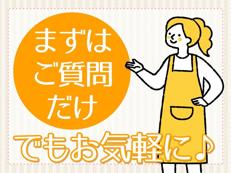 求めている人材 30代・40代・50代の 主婦さんが活躍中です。 スタッフは全員女性です。 特別な資格やスキルは不要! 未経験からでも安心して 始められるお仕事です。 *・。*・。*・。*・。*・。*・。*・。 【こんな方におすすめ】 ・新しいことに挑戦したい方 ・落ち着いた職場で働きたい方 ・人の役に立つ仕事をしたい方 ・ブランクがあっても働きたい方 ・久しぶりの仕事復帰を考えている方 ・初めてのアルバイトやパートを探している方 ・ミドルやシニア世代で新たな仕事を始めたい方