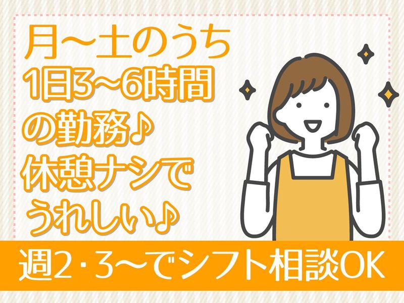 シフト制 勤務時間詳細 月火水木金 ①10:00~16:00 ※6時間勤務 ②13:00~16:00 ※3時間勤務 土 10:00~13:00 ※3時間勤務 上記の中で週2~OK シフトは応相談♪ 「休憩なしで働けてウレシイ」との声も♪ 「平日のみ」「曜日固定」「週3勤務」 などお気軽にお申し付けください!