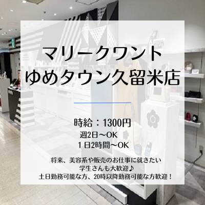 仕事内容 ⭐マリークワントショップでの化粧品・アパレル雑貨の販売⭐ コスメやファッション・アクセサリーなどの 多彩な商品をお客様にご案内するお仕事です。 ≪具体的には…≫ ⏩お客様へコスメ、ファッション商品のご提案 ⏩店舗のレイアウト変更 ⏩商品や備品の補充 ⏩店舗の清掃 etc. タッチアップの業務はないので 未経験の方でも安心してお仕事できます。 \こんな方にオススメ/ 学生・フリーターなど20~30代中心に活躍中!! 将来、美容系や販売のお仕事に就きたい 学生さんも大歓迎♪ 募集職種:アルバイト